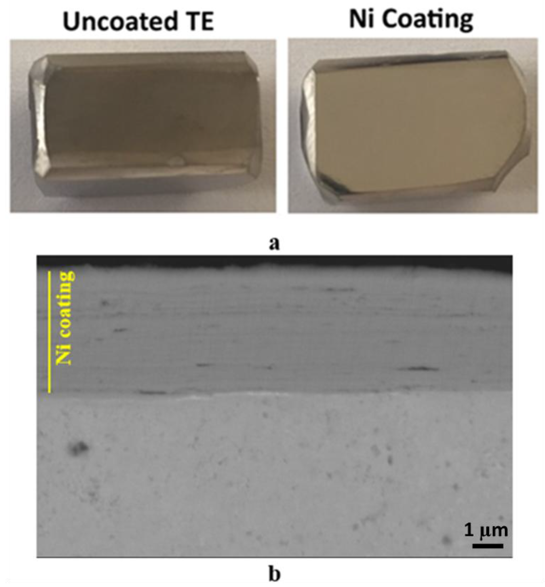Figure 8. (a) Images of the deposited coatings on the P-type TE material compared with the uncoated sample, and (b) cross-sectional backscattered electron microscope image of the coating layer.