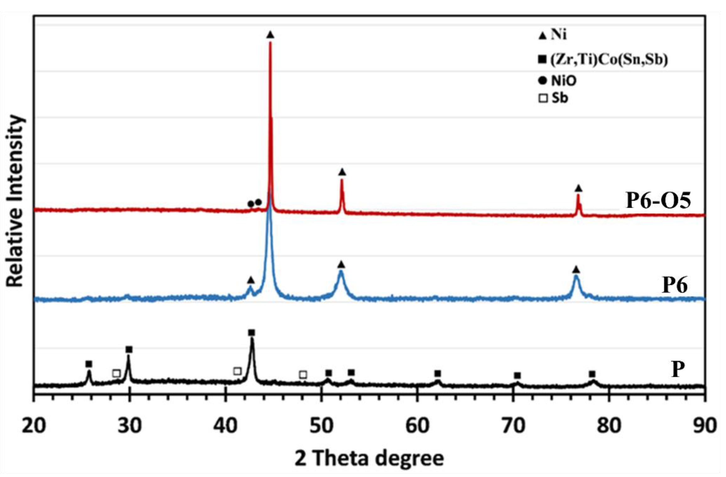XRD patterns of as-received P-type TE material were compared with the Ni-plated samples before and after static oxidation testing, as displayed in Figure 9. Patterns from as-produced P-type material identified a half-Heusler phase of (Zr,Ti)Co(Sn,Sb) with firm peaks. In addition, weak traces of the Sb phase were detected. As expected, high-intensity Ni peaks were identified for the Ni-plated sample (P6). After oxidation, in addition to the Ni peaks observed for the P6 sample, very weak NiO peaks were identified for the P6-O5 sample, indicating the formation of a very thin surface oxide layer on the coating. It was also observed that the full width at half maximum (FWHM) of the Ni peaks decreased considerably after oxidation, indicating that the Ni grain size on the sample increased with oxidation. Notably, no oxide peaks from the TE material were observed in the Ni-coated material, indicating that the coating protected it against oxidation.