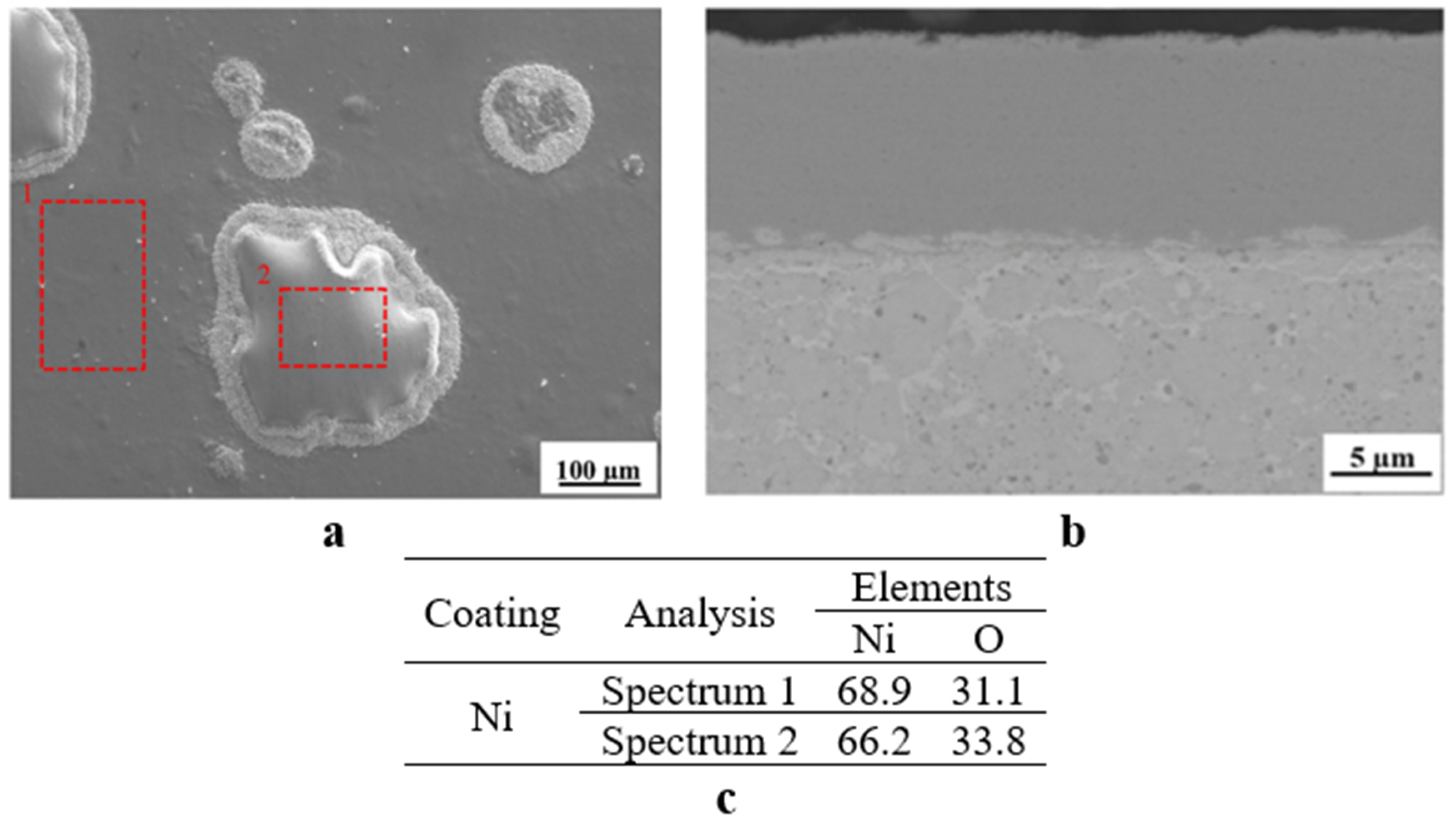 Figure 10. (a) Surface morphology, (b) cross-section of the Ni coating samples after oxidation testing, and (c) EDX analysing results of selected regions.