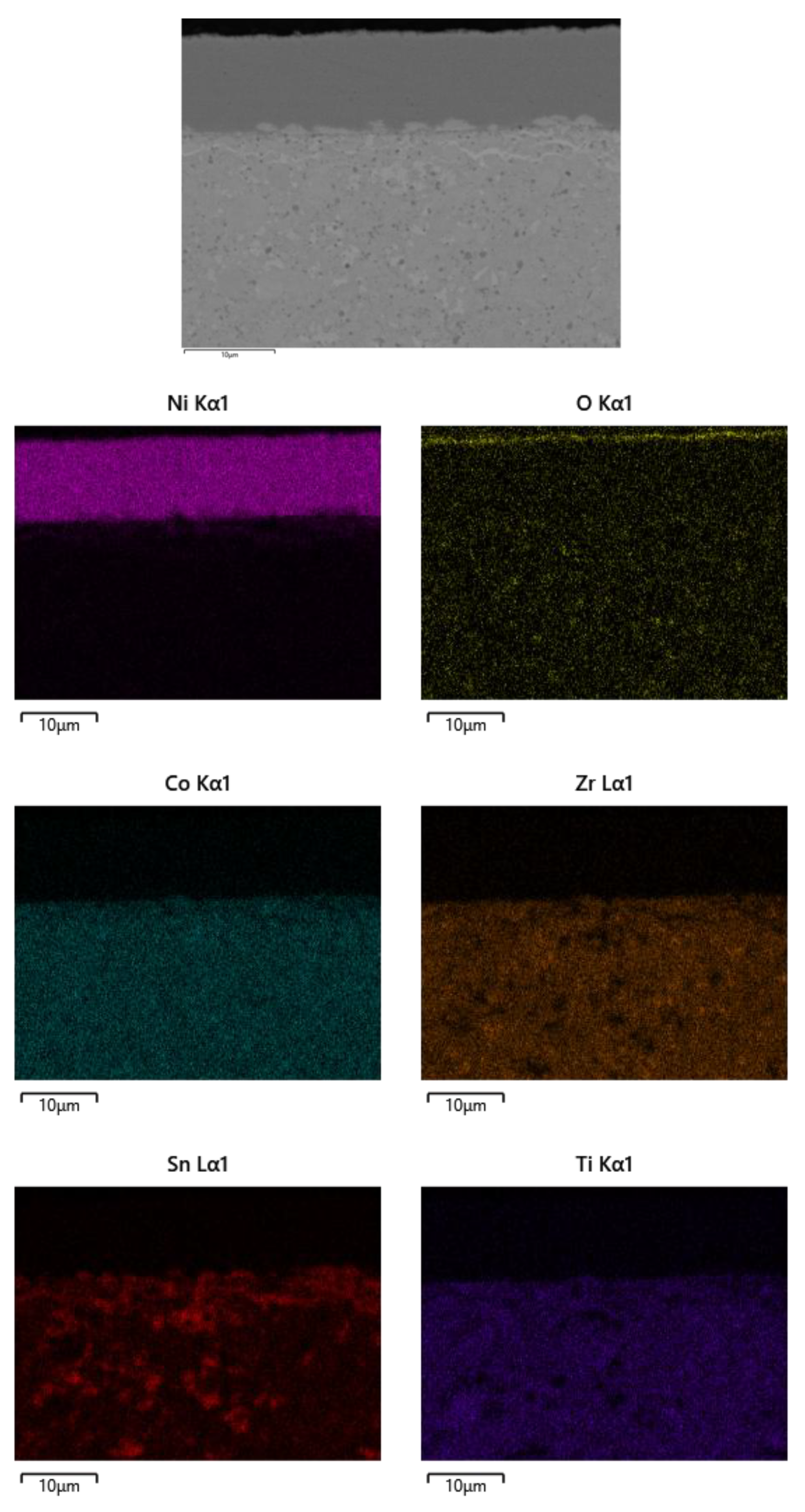 The element distribution was investigated across the cross-section of the P6-O5 sample by EDX elemental mapping, and the obtained results are presented in Figure 11. The oxygen concentration at the top of the coating layer is very high, meaning that a superficial nickel oxide layer would form on the top surface of the coating, as confirmed by the XRD results (Figure 9), which blocks oxygen inward diffusion into the Ni coating and the TE material, thus preventing oxidation of the TE material. Notably, some ignorable elemental diffusion at the interface between the coating and substrate material was observed. As previously mentioned, TE material has Sn and Sb, which can sublimate at moderate and high temperatures. Fortunately, the Ni coating significantly prevented sublimation of those elements and provided microstructural stability at 500 °C for 10 h.