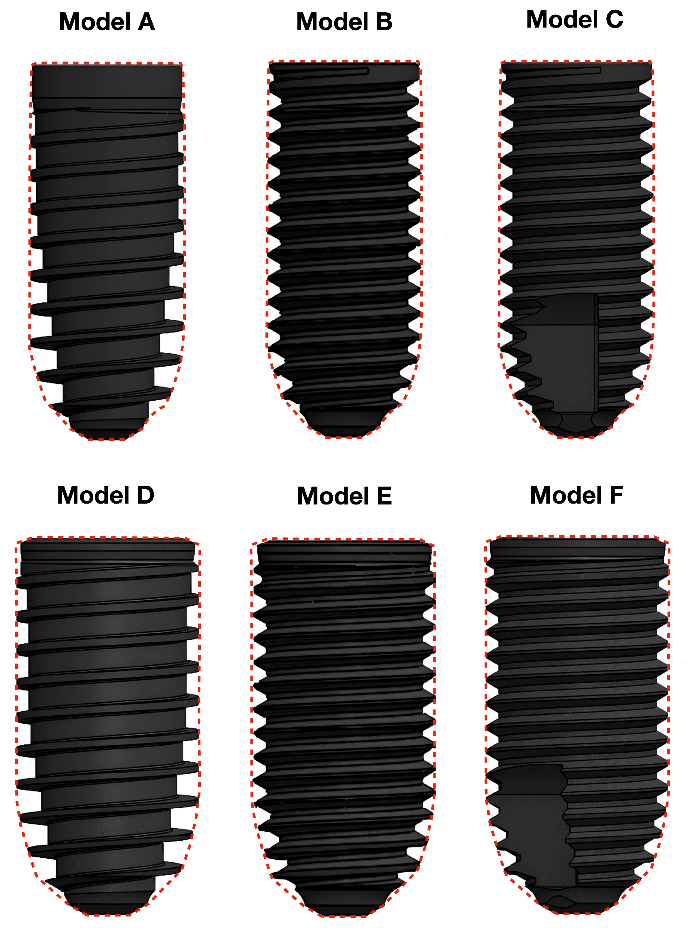 | Implant Model | Diameter (mm) | Length (mm) | Thread Depth (mm) | Thread Angle (°) | Thread Pitch (mm) | Total Surface Area (mm2) |