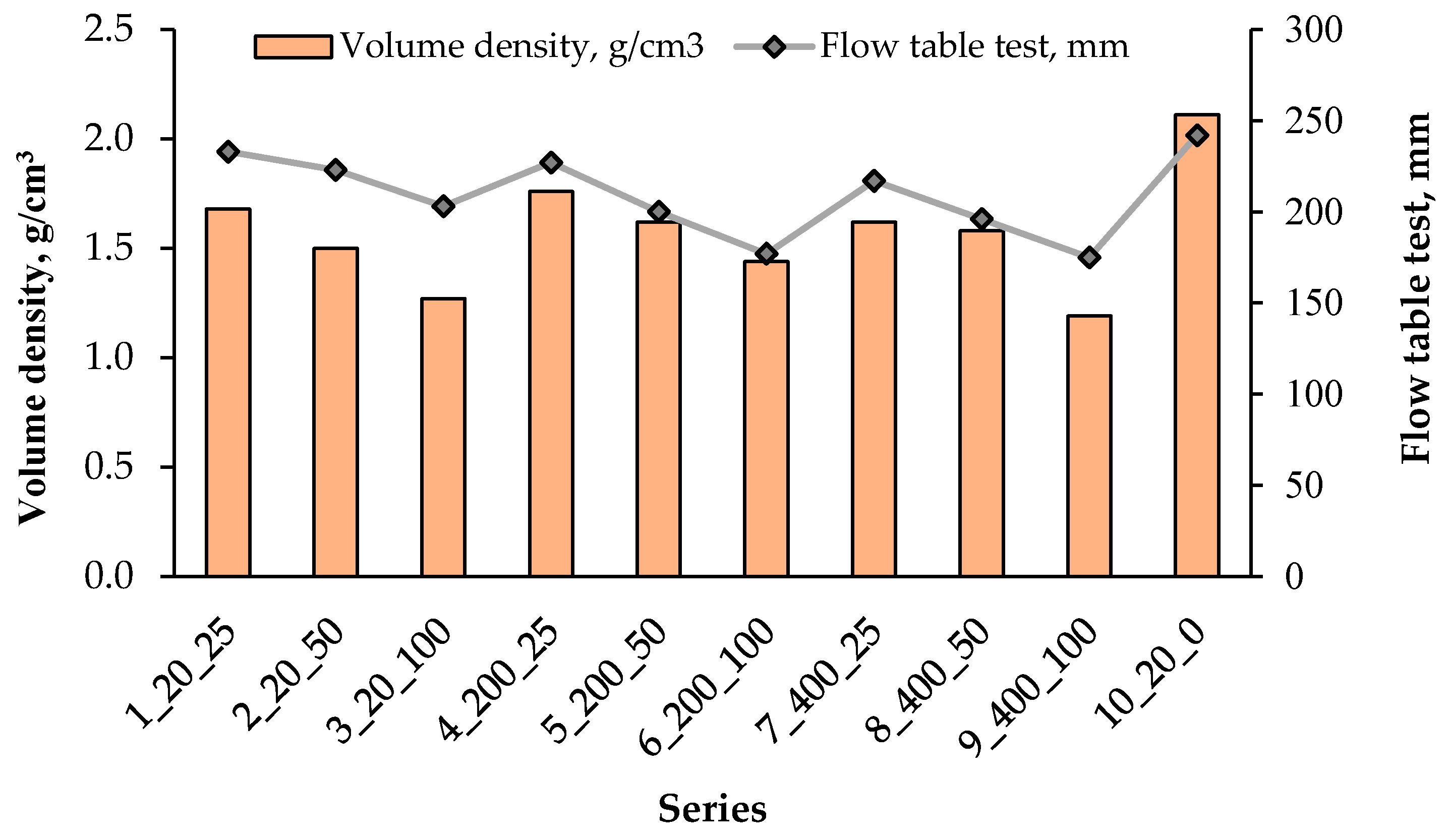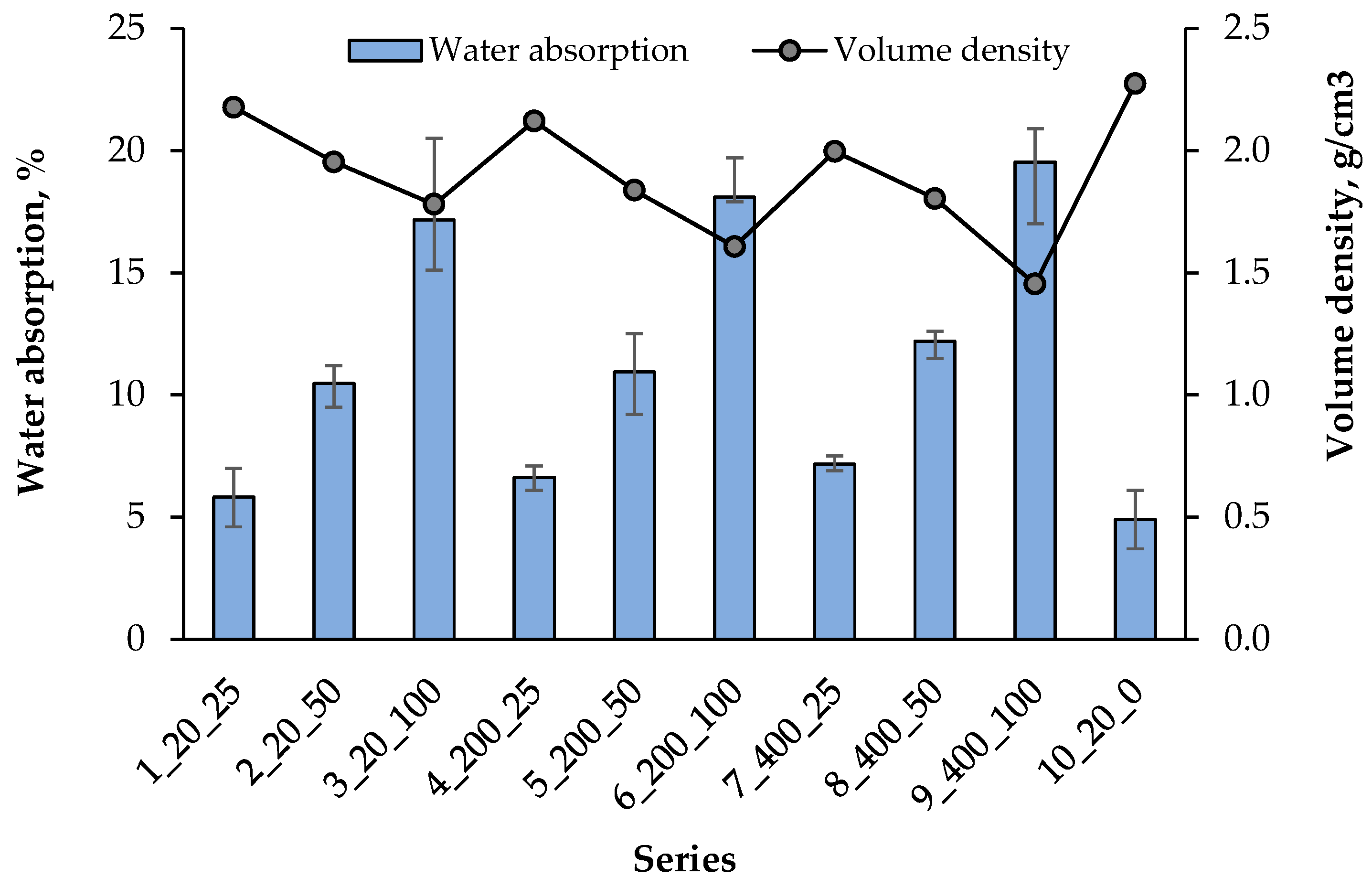 | Series | Composition/Fraction, mm | Hardening Temperature, °C | Bulk Density in a Loose State, g/cm3 | Bulk Density in a Compacted State, g/cm3 | Volume Density, g/cm3 | Water Absorption, % Mass | Compressive Strength, MPa | |