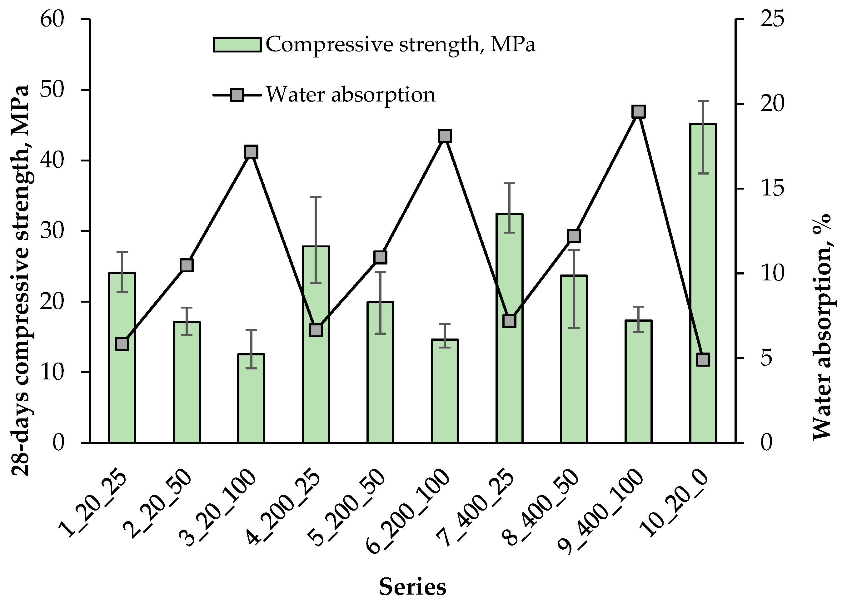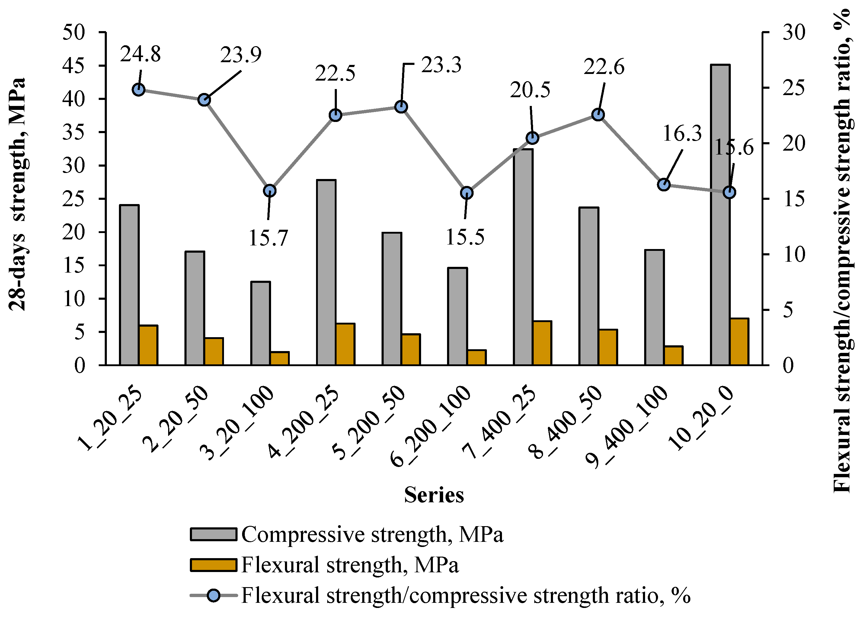 - The best compressive and flexural strength results of composites with artificial aggregates were obtained in Series 7, containing 25% Aas, cured at 400 °C.