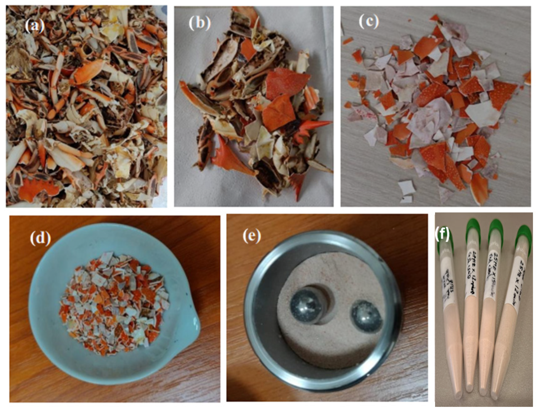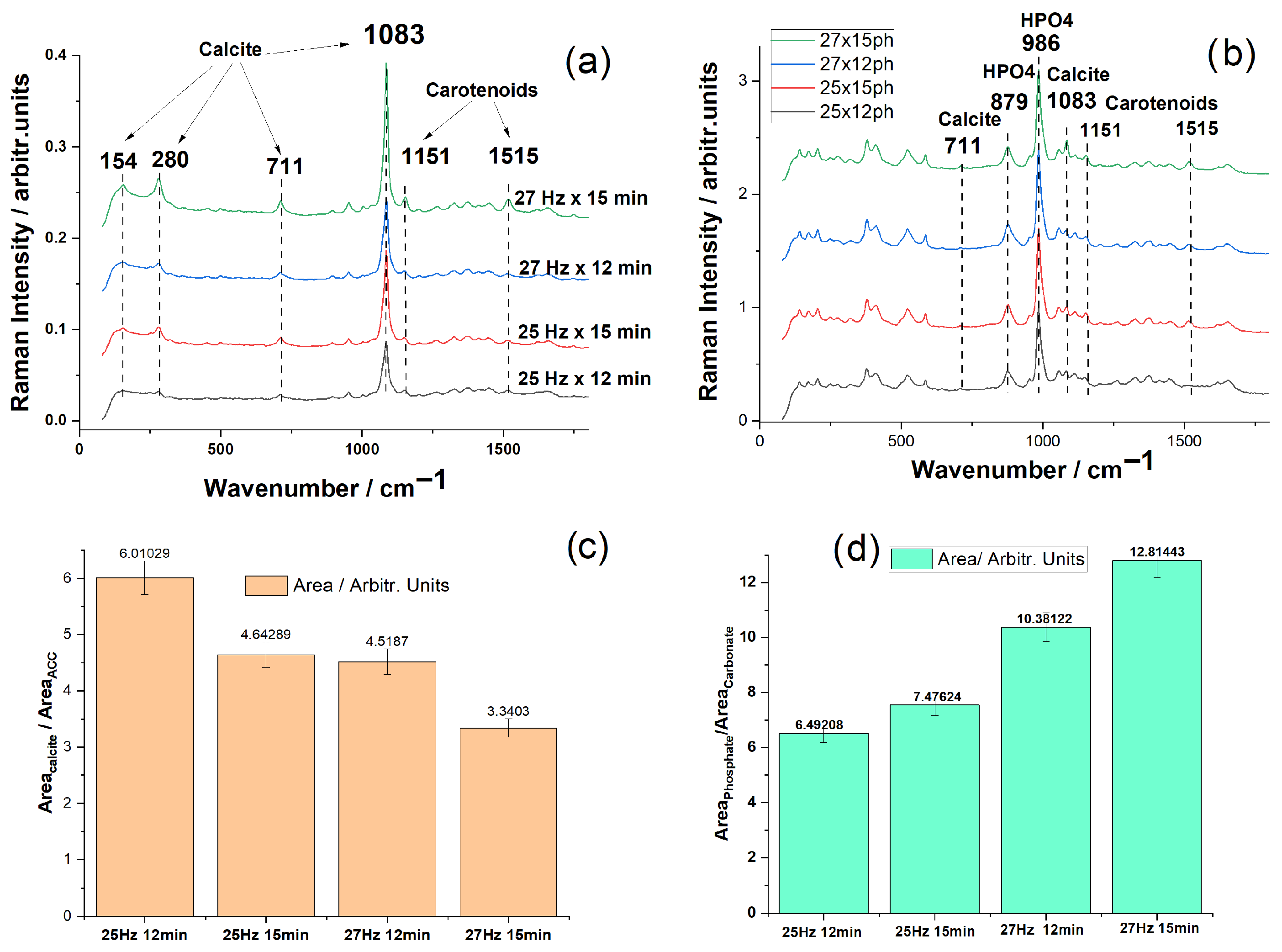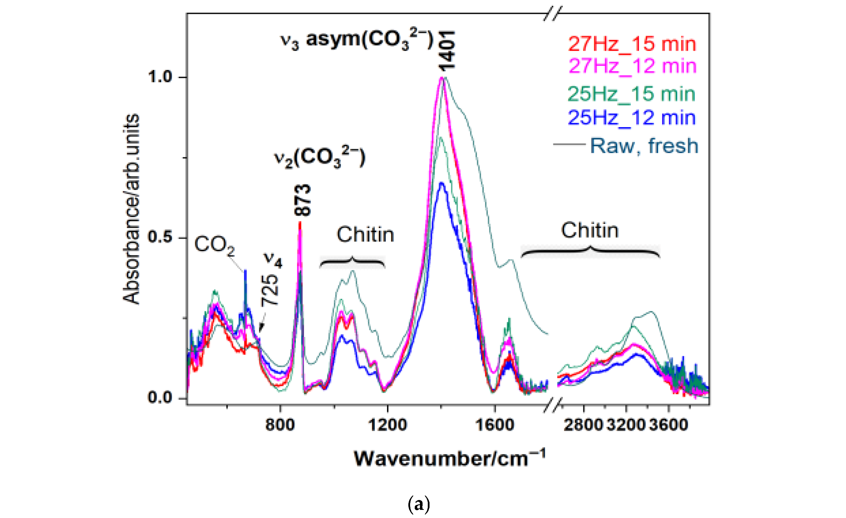 - Lazar, G.; Tămaş, T.; Barbu-Tudoran, L.; Venter, M.; Bajama, I.; Pinzaru, S. Biowaste valorisation: Conversion of Crab Shell-Derived Mg-Calcite into Calcium Phosphate Minerals Controlled by Raman Spectroscopy. Processes 2025, 13, 3413. [Google Scholar] [CrossRef]