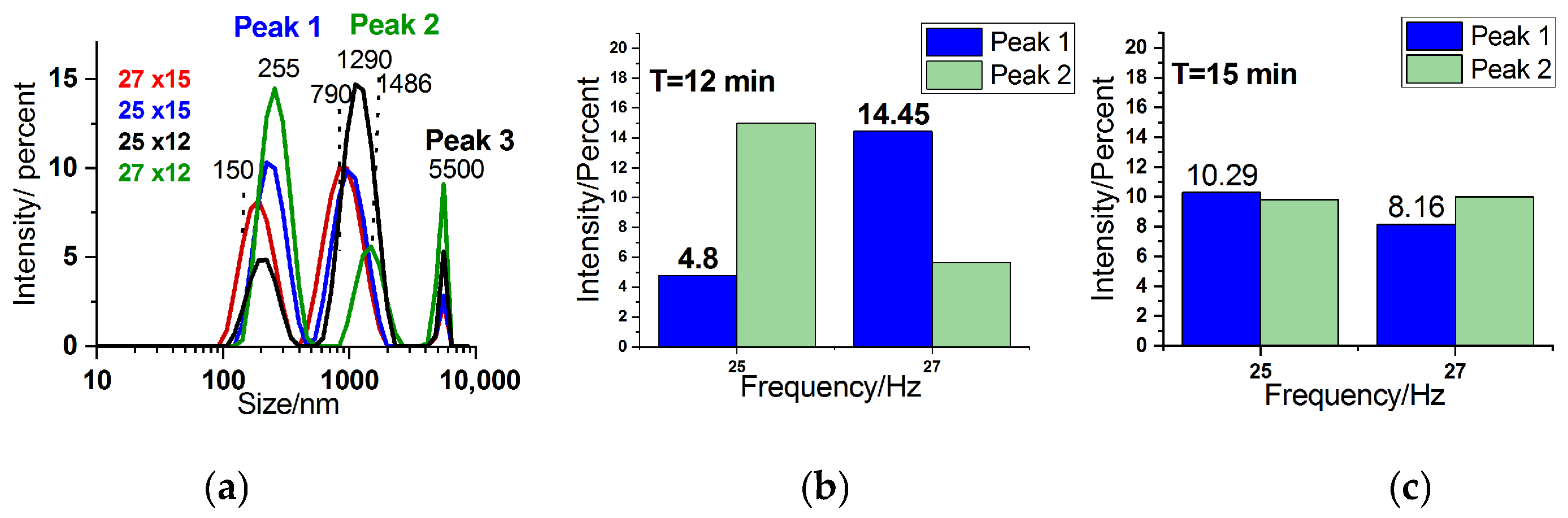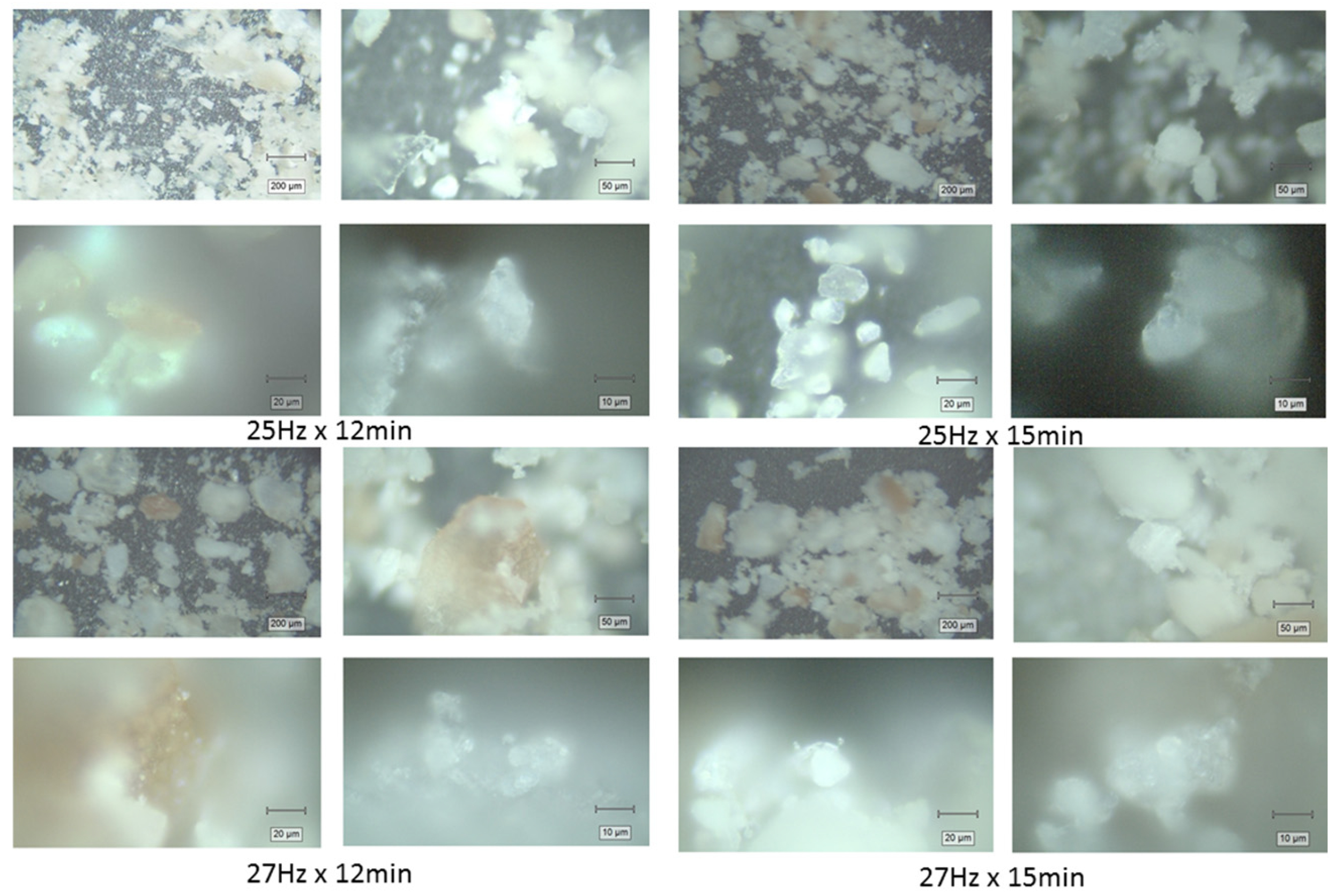 | Milling Conditions (Frequency, Time) | Particle Size Observed Under Optical Microscopy/μm | |||