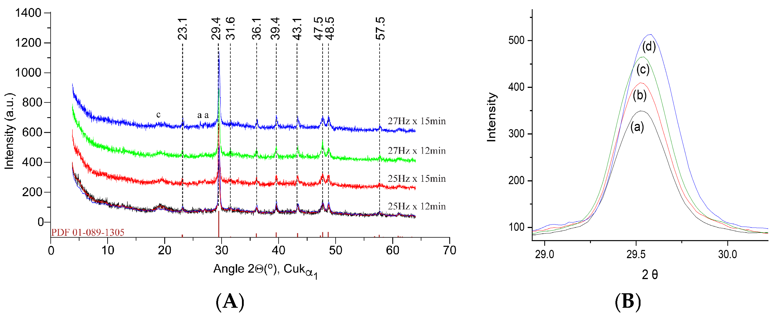 - Marchini, C.; Triunfo, C.; Greggio, N.; Fermani, S.; Montroni, D.; Migliori, A.; Gradone, A.; Goffredo, S.; Maoloni, G.; Gómez Morales, J.; et al. Nanocrystalline and Amorphous Calcium Carbonate from Waste Seashells by Ball Milling Mechanochemistry Processes. Cryst. Growth Des. 2024, 24, 657–668. [Google Scholar] [CrossRef]