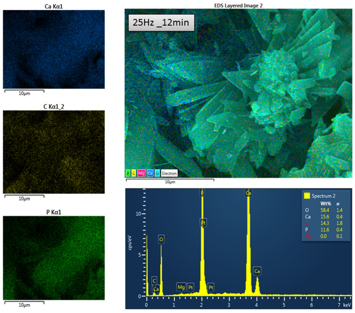 3.2.3. SEM-EDX Analyses of the Resulted Phosphate Mineral