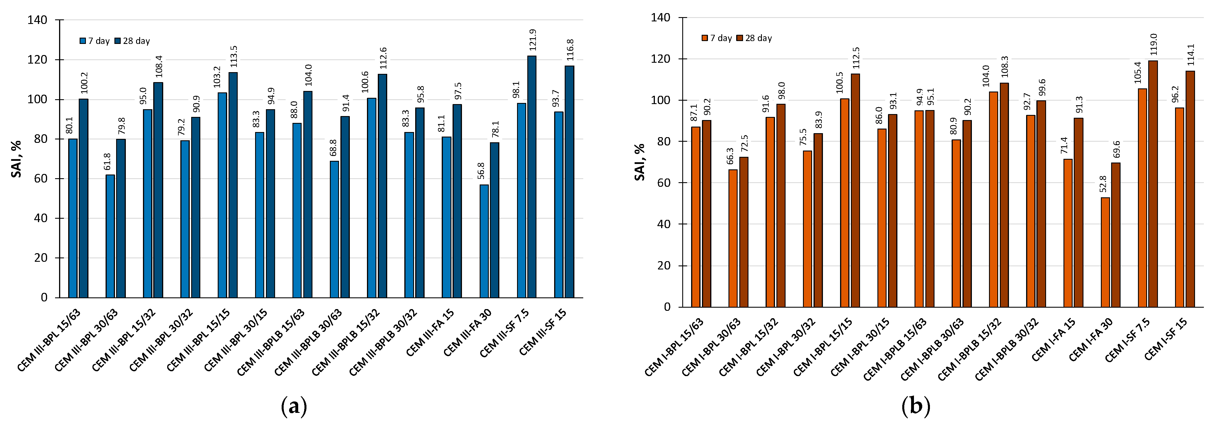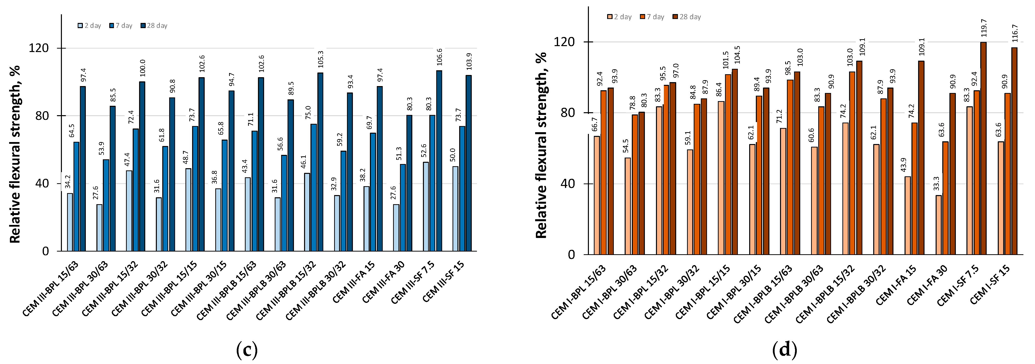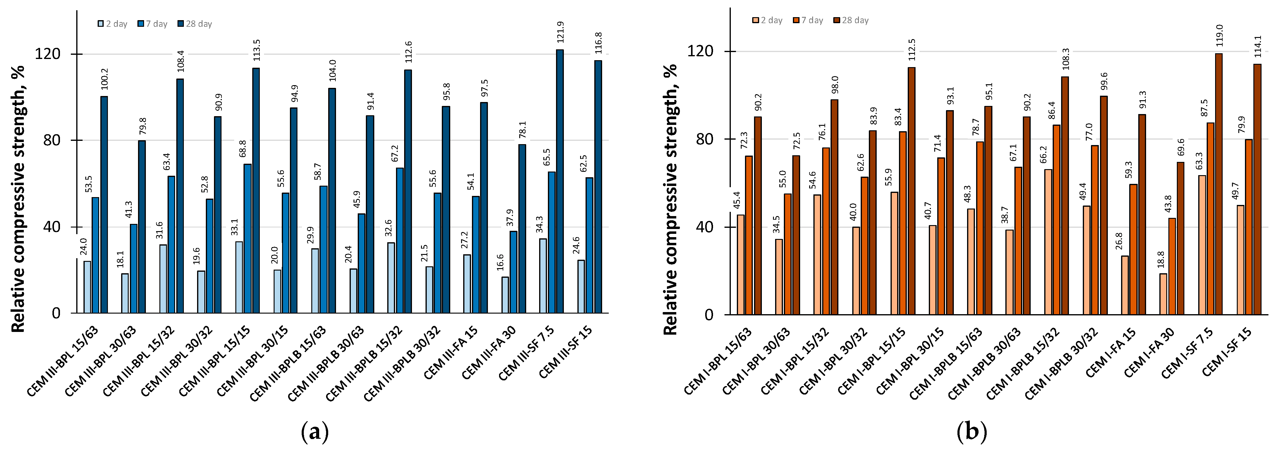 - The highest strength values can be achieved by replacing slag cement or ordinary fast-hardening cement with up to 15% BPL powder, fineness 15 μm or up to 15% BPLB powder, fineness 32 μm. This is attributed to the chemical composition of the by-products used. Thus, it can be concluded that a SiO2 deficit exceeding 5% in brick powder cannot be compensated by further grinding;