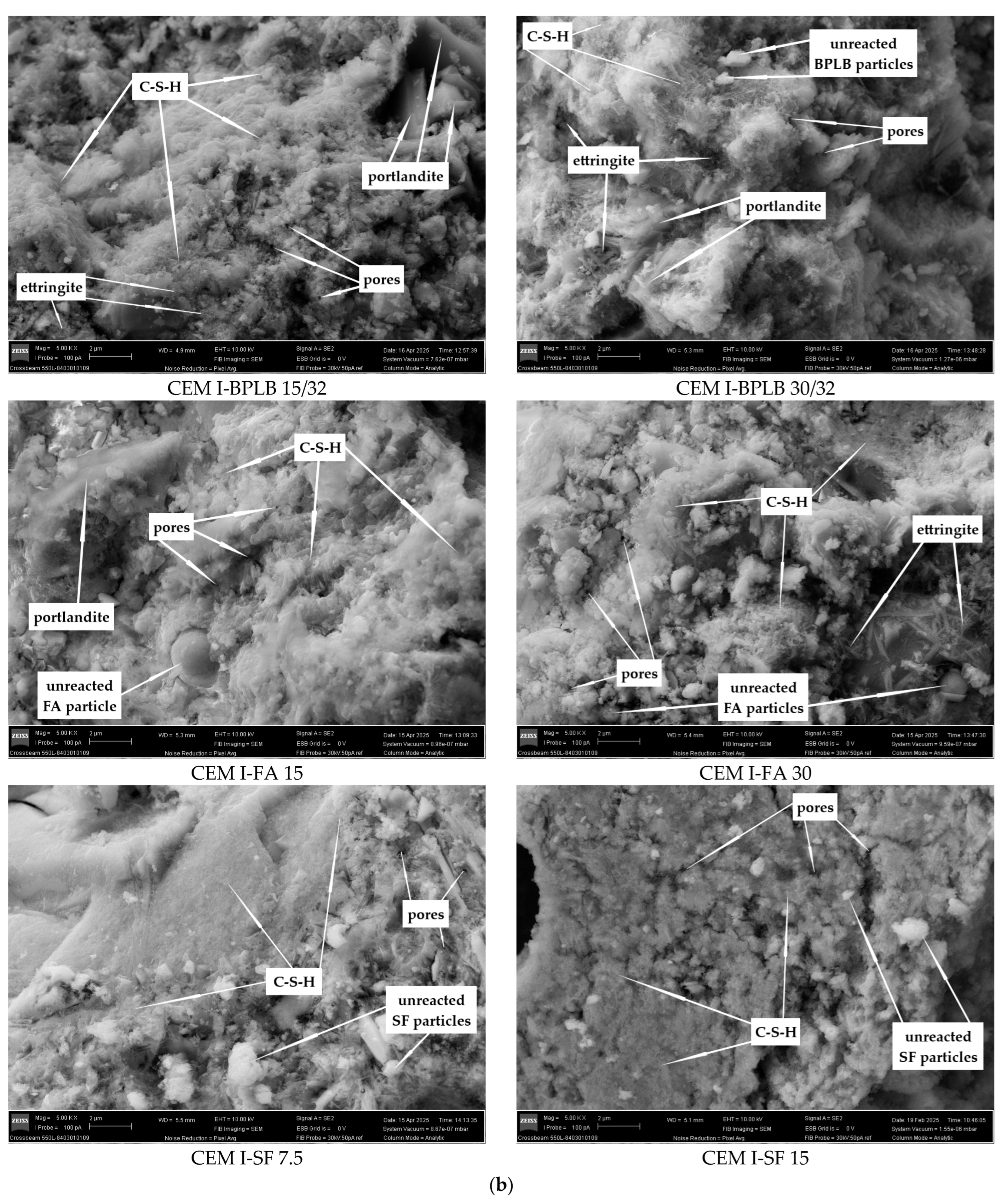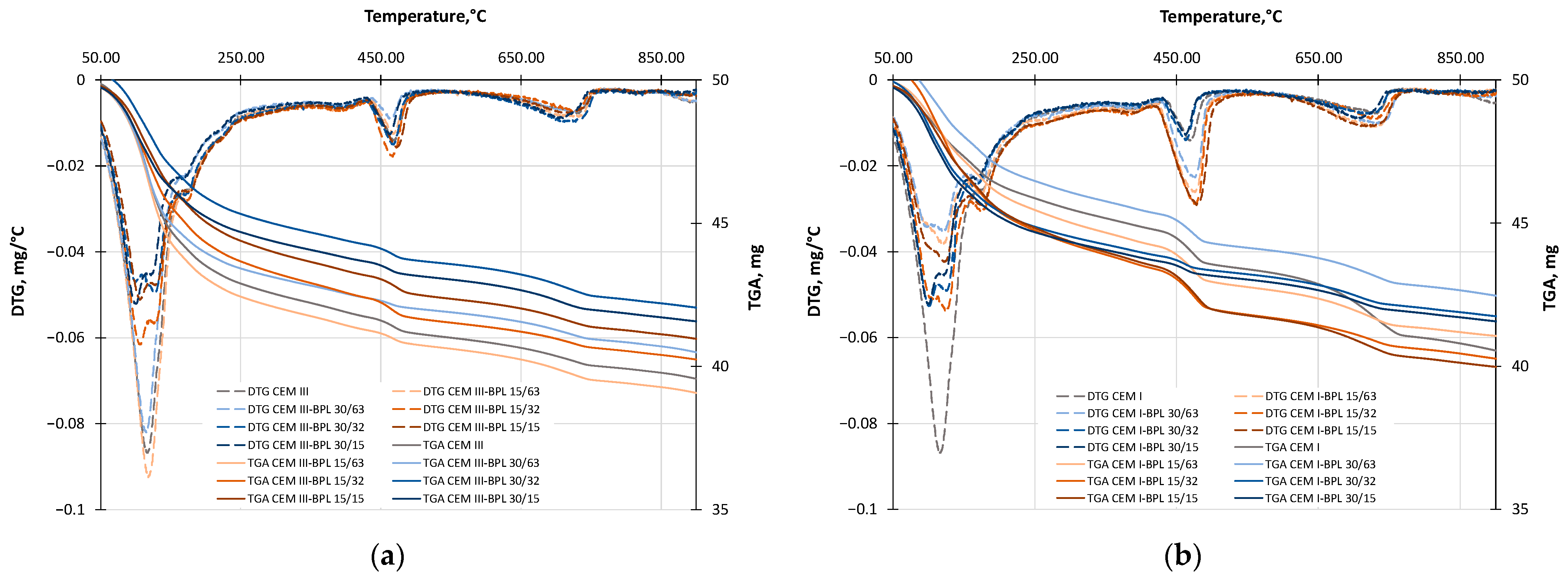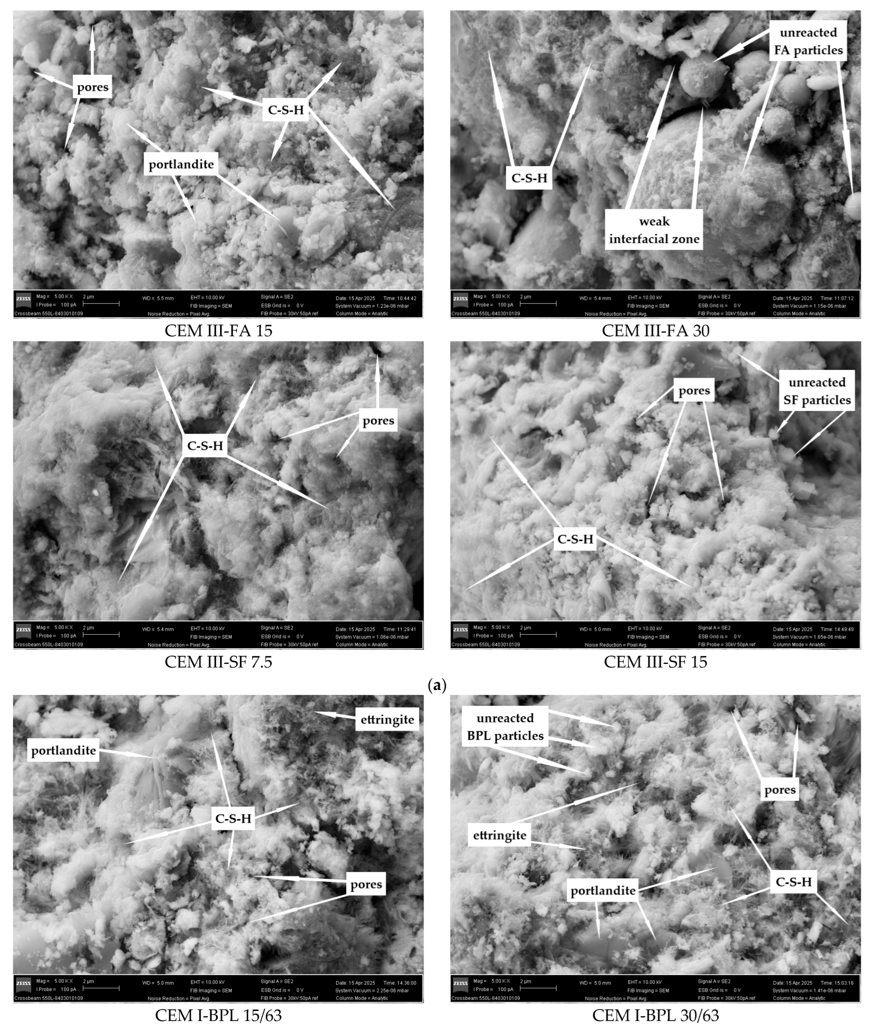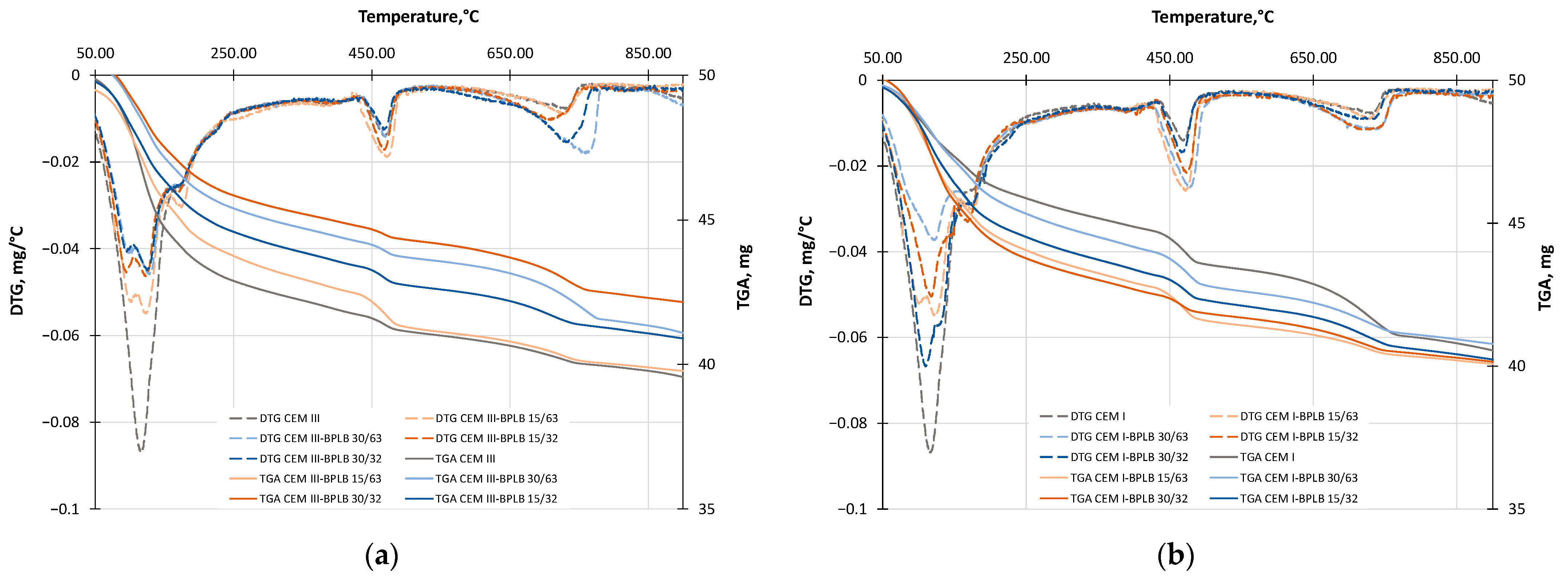 - Vaičiukynienė, D.; Nizeviciene, D.; Kantautas, A.; Tamošaitis, G.; Villalon Fornes, I.; Kryvenko, P.; Boiko, O. Effect of Large Amounts of Supplementary Cementitious Material on the Hydration of Blended Cement. J. Mater. Civ. Eng. 2025, 37, 04025091. [Google Scholar] [CrossRef]