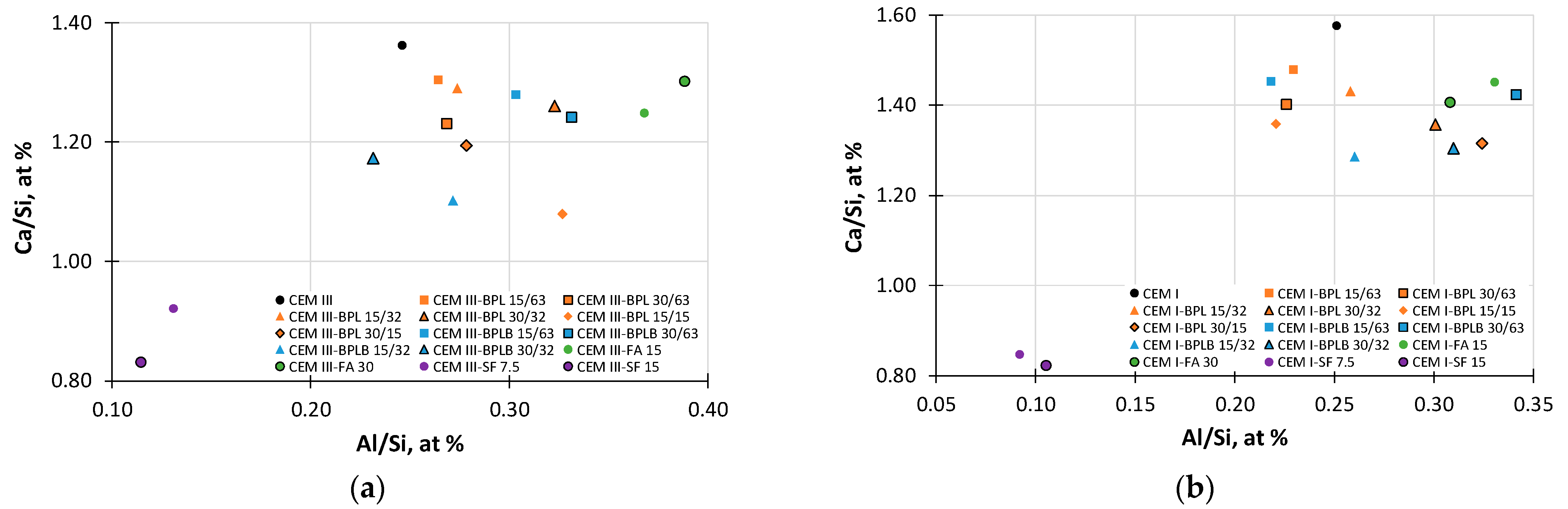 - Lothenbach, B.; Nonat, A. Calcium Silicate Hydrates: Solid and Liquid Phase Composition. Cem. Concr. Res. 2015, 78, 57–70. [Google Scholar] [CrossRef]