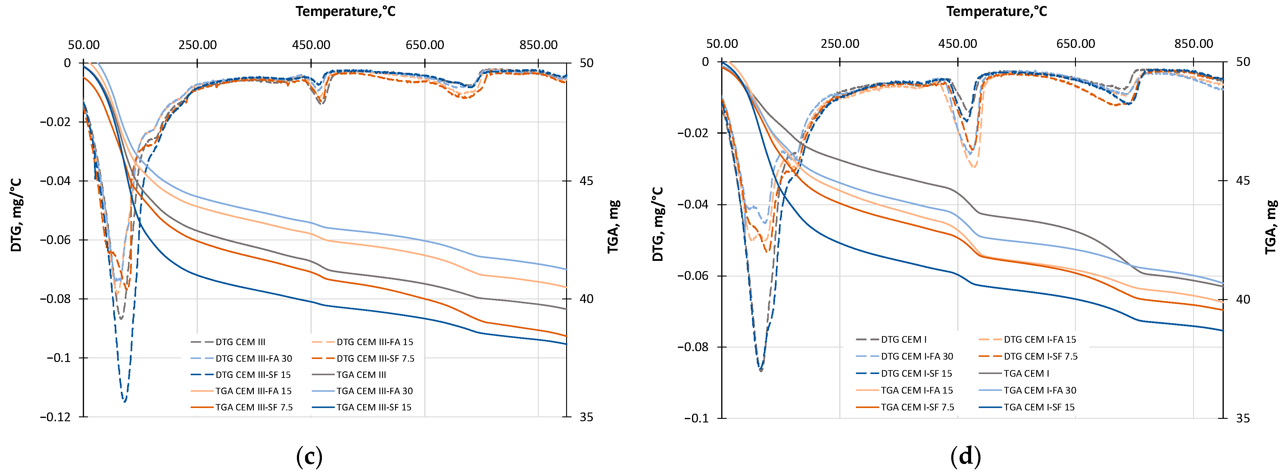 - Kuzielová, E.; Slaný, M.; Žemlička, M.; Másilko, J.; Palou, M.T. Phase Composition of Silica Fume—Portland Cement Systems Formed Under Hydrothermal Curing Evaluated by FTIR, XRD, and TGA. Materials 2021, 14, 2786. [Google Scholar] [CrossRef]