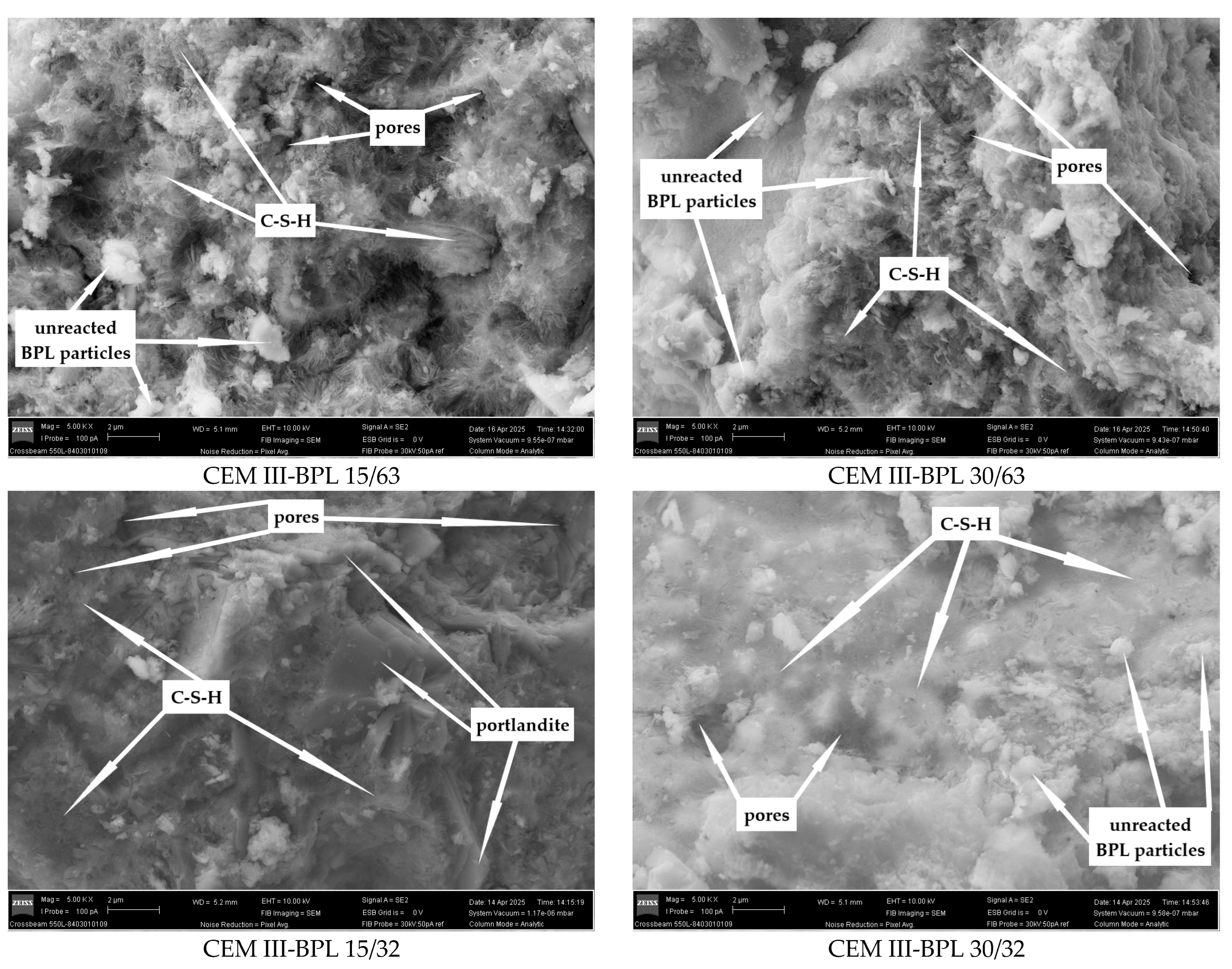 - Microstructural analysis using TGA/DTG, SEM, and EDX methods detailed the degree of hydrate phase formation after modifying blended cement composites. Specifically, the pozzolanic activity of the two brick powder types was confirmed, and the features of its chemical composition for the formation of low-basicity C-A-S-H gel in blended cement systems were established. The results demonstrate a strong correlation with strength indicators and the strength activity index.
