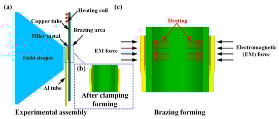 Schematic diagrams of magnetic pulse-assisted semi-solid brazing experiment. (a) Schematic of clamping assembly; (b) schematic of joint after clamping; (c) schematic of brazing forming.