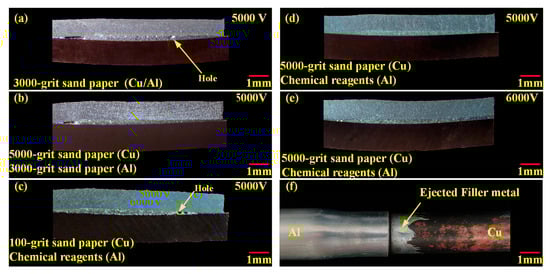 Macromorphology of joints obtained under different process parameters: (a) 5000 V/Al (3000-grit sandpaper)/Cu (3000-grit sandpaper); (b) 5000 V/Al (3000-grit sandpaper)/Cu (5000-grit sandpaper); (c) 5000 V/Al (chemical cleaning)/Cu (100-grit sandpaper); (d) 5000 V/Al (chemical cleaning)/Cu (5000-grit sandpaper); (e) 6000 V/Al (chemical cleaning)/Cu (5000-grit sandpaper); (f) Cu/Al tube joint.