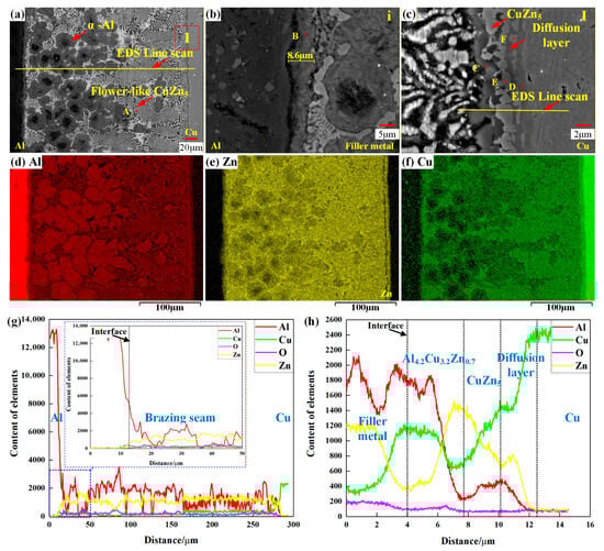 Figure 4b shows the microstructure of the aluminum–side interface, where a diffusion layer with a width of 8.6 μm is formed. No brittle Cu/Al IMCs are detected. Consistent with the line scan results in Figure 4g, both Cu and Zn elements can diffuse toward the aluminum–side interface, but their contents are much lower than that of Al. Further, the EDS point analysis (Point B in Table 2) confirms that the Cu content in the diffusion layer is extremely low, only 0.75 at.%.
