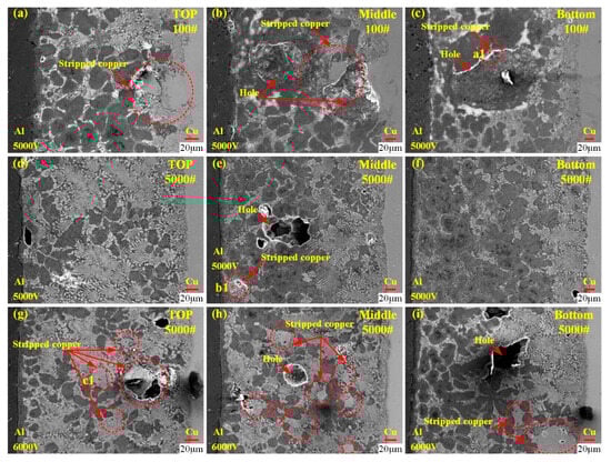 Figure 6 shows the joint microstructures obtained under different brazing forming voltages and copper tube surface roughness. It should be noted that in all the experiments corresponding to Figure 6, the aluminum tube surfaces were only cleaned with chemical reagents, with no sandpaper polishing applied. Specifically, Figure 6a–c present the joint microstructures obtained at a brazing forming voltage of 5000 V, where the copper tube was polished with 100-grit sandpaper; Figure 6d–f also correspond to a brazing forming voltage of 5000 V, but with the copper tube polished with 5000-grit sandpaper; and Figure 6g–i show the joint microstructures obtained at a higher brazing forming voltage of 6000 V, with the copper tube still polished with 5000-grit sandpaper.