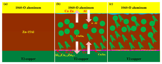 Schematic diagram of element diffusion and microstructure evolution in MPASSB Cu/Al tube joint. (a) Initial state; (b) schematic of element diffusion; (c) schematic of microstructure after brazing formation.