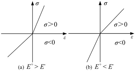 Ambartsumyan’s theory of bimodulus elasticity stipulates that the establishment of the material’s constitutive model is based on the positive or negative signs of the principal stresses as the decisive factor. Therefore, the direction and sign of the principal stresses play a pivotal role. Depending on the signs of the principal stresses, they can be categorized into two types: (1) The first type of point or region, where all principal stresses have the same sign, meaning it is either a fully compressed or fully tensioned area; (2) The second type of point or region, where the sign of one principal stress is opposite to the other two. For the first type of region, the expression of the bimodulus theory of elasticity is the same as that of classical elasticity theory. For the second type of region, Ambartsumyan employs two linear segments to approximate the stress–strain relationship of the bimodulus material; that is, he represents it with piecewise linear segments that have a discontinuous tangent at the origin (see Figure 1). When subjected to tension, the material’s elastic modulus and Poisson’s ratio are represented by and , respectively. Under compression, the material’s elastic modulus and Poisson’s ratio are represented by and , respectively.