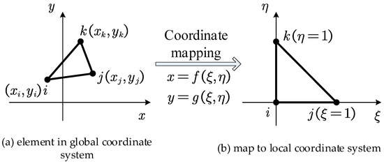 For the triangular element with three nodes, as shown in Figure 3a, local coordinates and that satisfy Equation (19) are introduced to map the element onto the local coordinate system shown in Figure 3b.