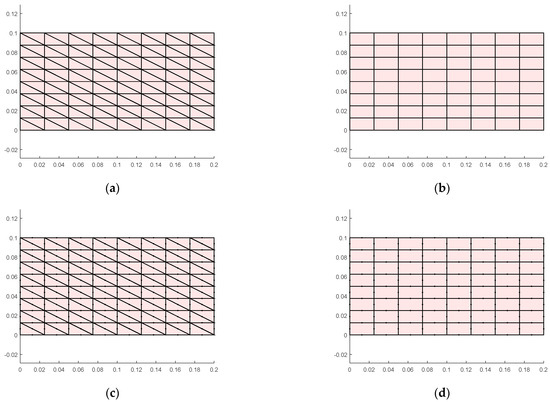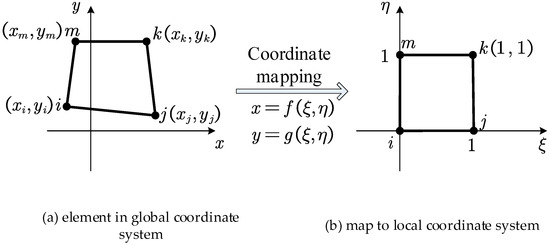For the rectangular element with four nodes, as shown in Figure 4a, local coordinates and that satisfy Equation (25) are introduced to map the element onto the local coordinate system shown in Figure 4b.