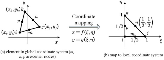 For the triangular element with six nodes, as shown in Figure 5a, local coordinates and that satisfy Equation (30) are introduced to map the element onto the local coordinate system shown in Figure 5b.