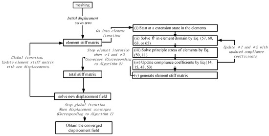 Since the nodal displacements are initially unknown, an iterative solution is required. An initial displacement field is assumed, and then the principal stress direction angles within the element are determined. Combining this with Equation (50) and Equation (9), the signs of the principal stresses are established. Based on the signs of the principal stresses, the element’s elastic compliance matrix is updated using Equations (2)–(4), the overall stiffness matrix is assembled, and a new displacement field is obtained. This process is iterated until the displacements converge.