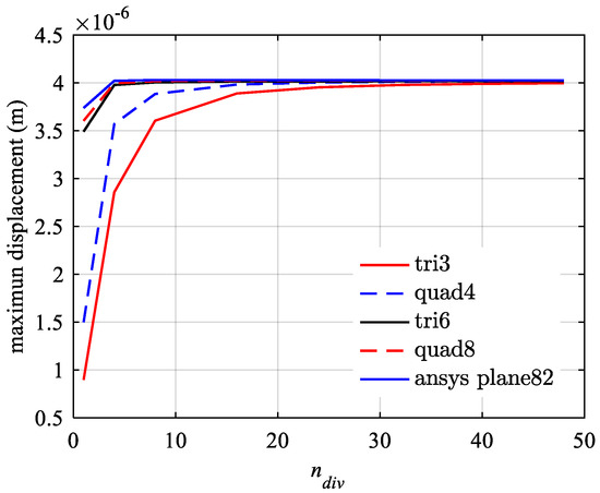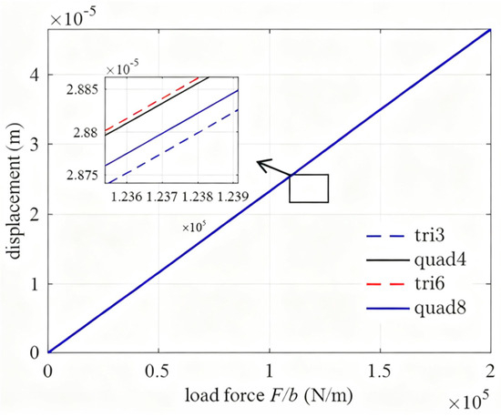 Considering the structure shown in Figure 8, with parameter settings of , a length of 0.2 m, and a height of 0.1 m, the load–displacement curve is examined. To ensure solution accuracy, different meshes are used for different elements. According to the results in Table 1, for the TRI3 element, , for the QUAD4 element, , for the TRI6 element, , and for the QUAD8 element, . Such settings are adopted to control the calculation result errors of each model within 1% or less. The calculation results are shown in Figure 13. It can be observed that the results calculated by the four models have good consistency. What differs is the size of the element mesh required to achieve the same accuracy, which can be selected as needed when solving actual problems. Additionally, although the material is considered to have a bimodulus characteristic and exhibits nonlinearity, for the same type of load, the displacement–load curve remains linear. This holds true for cases of proportional loading where the distributions of tensile and compressive regions remain unchanged, whereas it does not apply to scenarios involving mixed boundary conditions or situations where increased loading alters the distribution of tensile and compressive zones. This is because as the load increases, the internal stress in the structure also increases proportionally. Changing only the load magnitude does not change the principal stress direction within the structure, thus not causing changes in the tension–compression regions, affecting the overall stiffness of the structure.
