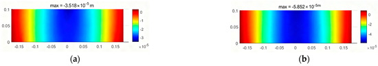 Vertical displacement contour of bending test model. (a) Vertical displacement contour considering tension–compression isotropic modulus, (b) vertical displacement contour considering bimodulus property.