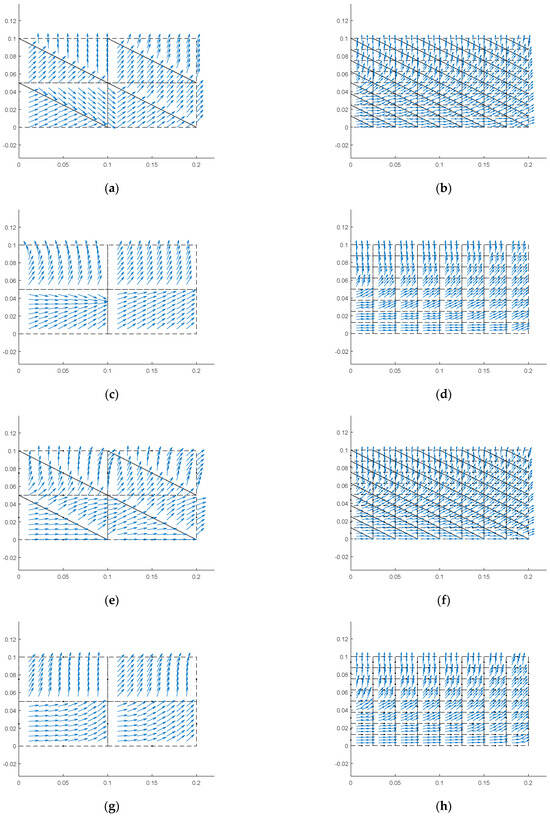 Orientation of the maximum principal stress within various element models. (a) tri3 element with ndiv = 2, (b) tri3 element with ndiv = 8, (c) quad4 element with ndiv = 2, (d) quad4 element with ndiv = 8, (e) tri6 element with ndiv = 2, (f) tri6 element with ndiv = 8, (g) quad8 element with ndiv = 2, (h) quad8 element with ndiv = 8.