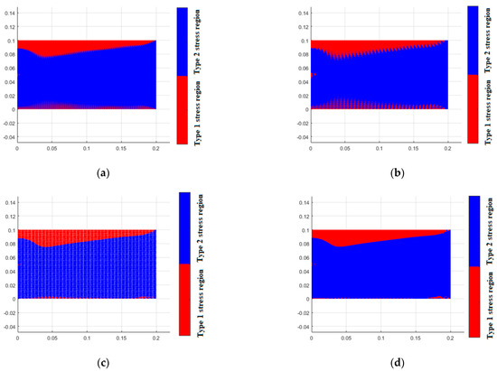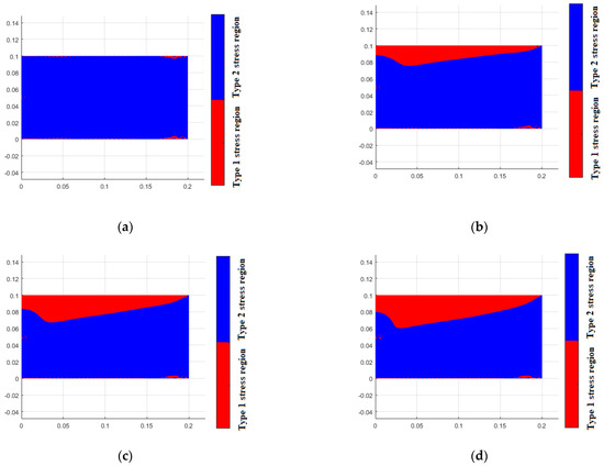 Types of stress region for different element models (Et = 200 GPa, Ec = 180 GPa). (a) tri3, (b) quad4, (c) tri6, (d) quad8.