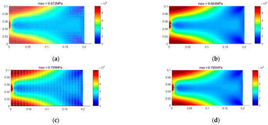 Stress distribution for different element models (Et = 200 GPa, Ec = 180 GPa). (a) tri3, (b) quad4, (c) tri6, (d) quad8.
