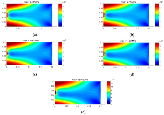 Stress distribution for different Et/Ec. (a) Et = 200 GPa, Ec = 200 GPa, (b) Et = 200 GPa, Ec = 180 GPa, (c) Et = 200 GPa, Ec = 160 GPa, (d) Et = 200 GPa, Ec = 140 GPa, (e) Et = 200 GPa, Ec = 120 GPa.