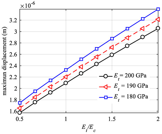 Figure 19 presents the maximum displacement versus tension–compression modulus ratio curve, and Figure 20 illustrates the maximum von Mises stress versus tension–compression modulus ratio curve. The curves in both figures are plotted with a fixed tensile modulus , examining the outcomes as the tension–compression modulus ratio varies. It is evident that the tension–compression modulus ratio significantly influences both displacement and stress. In Figure 19, different maximum displacement results for the same tension–compression modulus ratio are observed due to the varying overall equivalent stiffness of the structure. Conversely, in Figure 20, the maximum von Mises stress results remain consistent for different values of the tension–compression modulus ratio under the same , indicating that when the body force is zero, the stress distribution is related to the load, boundary conditions, and the structure itself, rather than the material properties. This finding aligns with the conclusions of the theory of equal tension–compression modulus (classical elasticity theory).