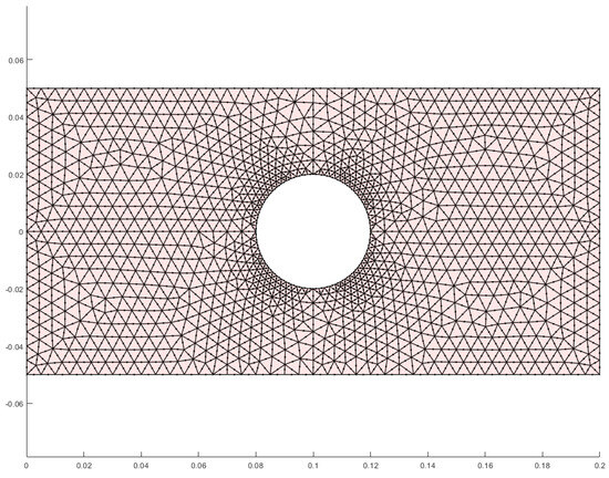 To further investigate the applicability of the finite element theory presented in this paper, a square plate with a center circular hole and different tension–compression moduli is examined. Given the high precision of the TRI6 element and its strong capability in simulating the principal stress directions, along with its adaptability to complex structures, calculations are performed using the TRI6 element. After meshing the structure, the finite element model is obtained as shown in Figure 21. Figure 22 displays the results of the two types of stress regions, Figure 23 shows the stress contour of the overall structure, and Figure 24 illustrates the stress contour at the edge of the hole. The results demonstrate that after accounting for the difference between tensile and compressive moduli, the types of stress zones undergo significant changes (Figure 22). Moreover, the maximum stress at the hole edge increases from 9.36 MPa to 12.11 MPa (Figure 24). The complex stress state around the hole, where the principal stress directions significantly deviate from the geometric coordinate axes, presents an ideal scenario for evaluating the performance of the non-principal-direction constitutive model.