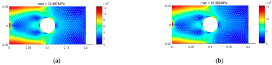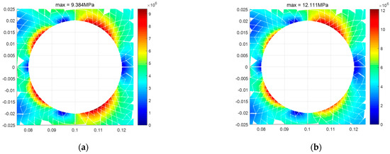 Stress contour at the edge of the hole. (a) Et = 200 GPa, Ec = 200 GPa, (b) Et = 200 GPa, Ec = 150 GPa.