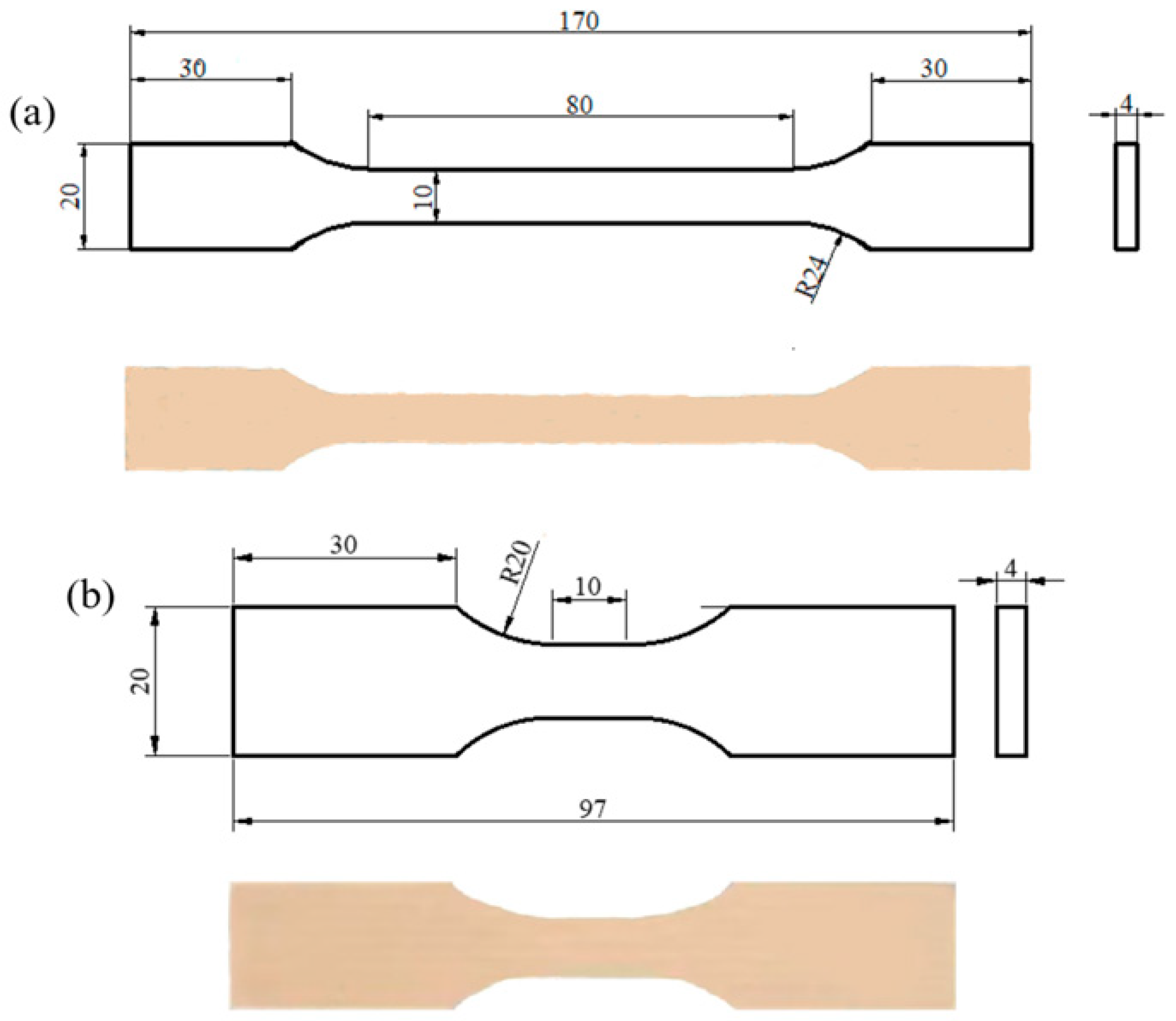 The quasi-static test specimens measured 170 mm in length, 20 mm in width, and 4 mm in thickness, while the dynamic test specimens measured 97 mm in length, 20 mm in width, and 4 mm in thickness. The quasi-static specimens’ dimensions are shown in