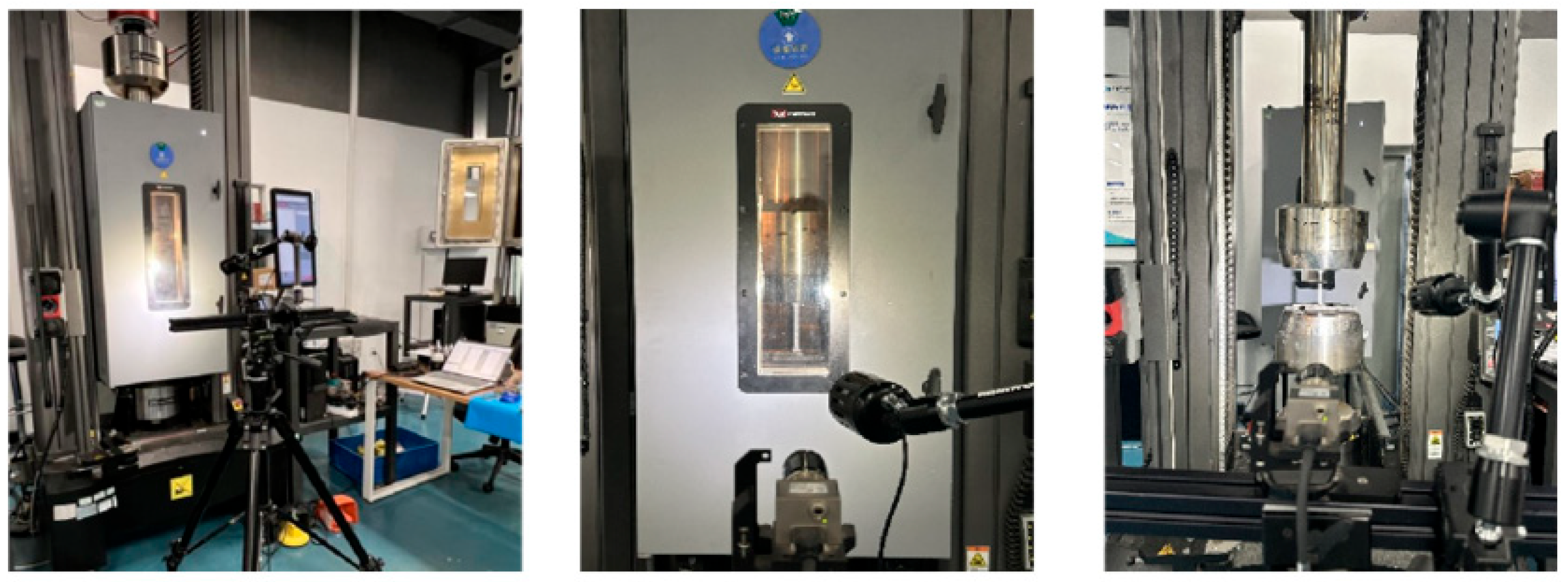 24], for elevated temperature testing, the environmental chamber was first heated to the predetermined temperature and maintained for 15 min prior to loading to ensure uniform thermal distribution throughout the specimen. To optimize the thermal condition and time efficiency, the subsequent specimen was co-placed in the chamber during current testing, reducing its thermal equilibration time to 5 min, thereby minimizing the total cycle time without compromising thermal stability or introducing unwanted thermal history variations. This method significantly enhances the efficiency of tensile testing at elevated temperatures.