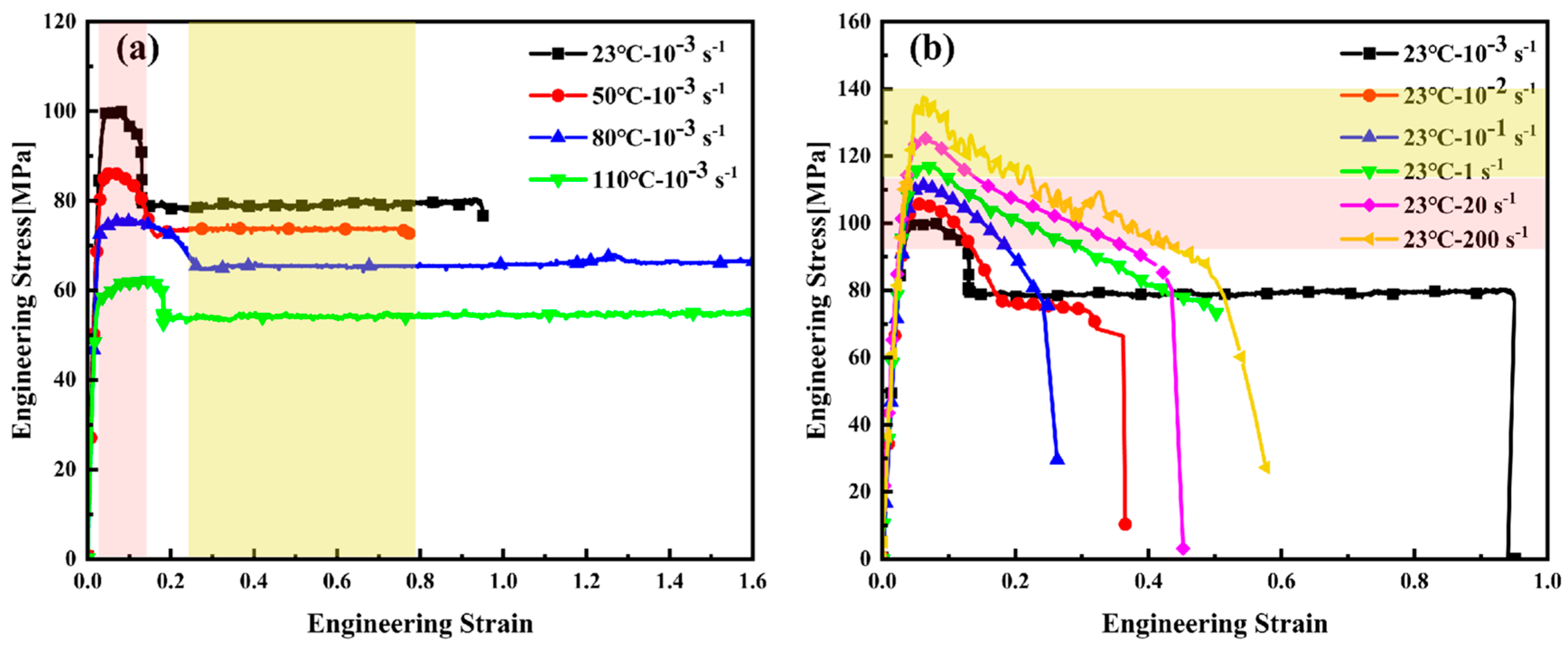 Figure 3b, the pink area indicates the low-strain-rate region, where a distinct yield peak and subsequent plateau are observable, characteristic of semi-crystalline polymers deforming under quasi-static conditions. The yellow area indicates the medium-to-high-strain-rate region, where no clear yield stress plateau is observed.