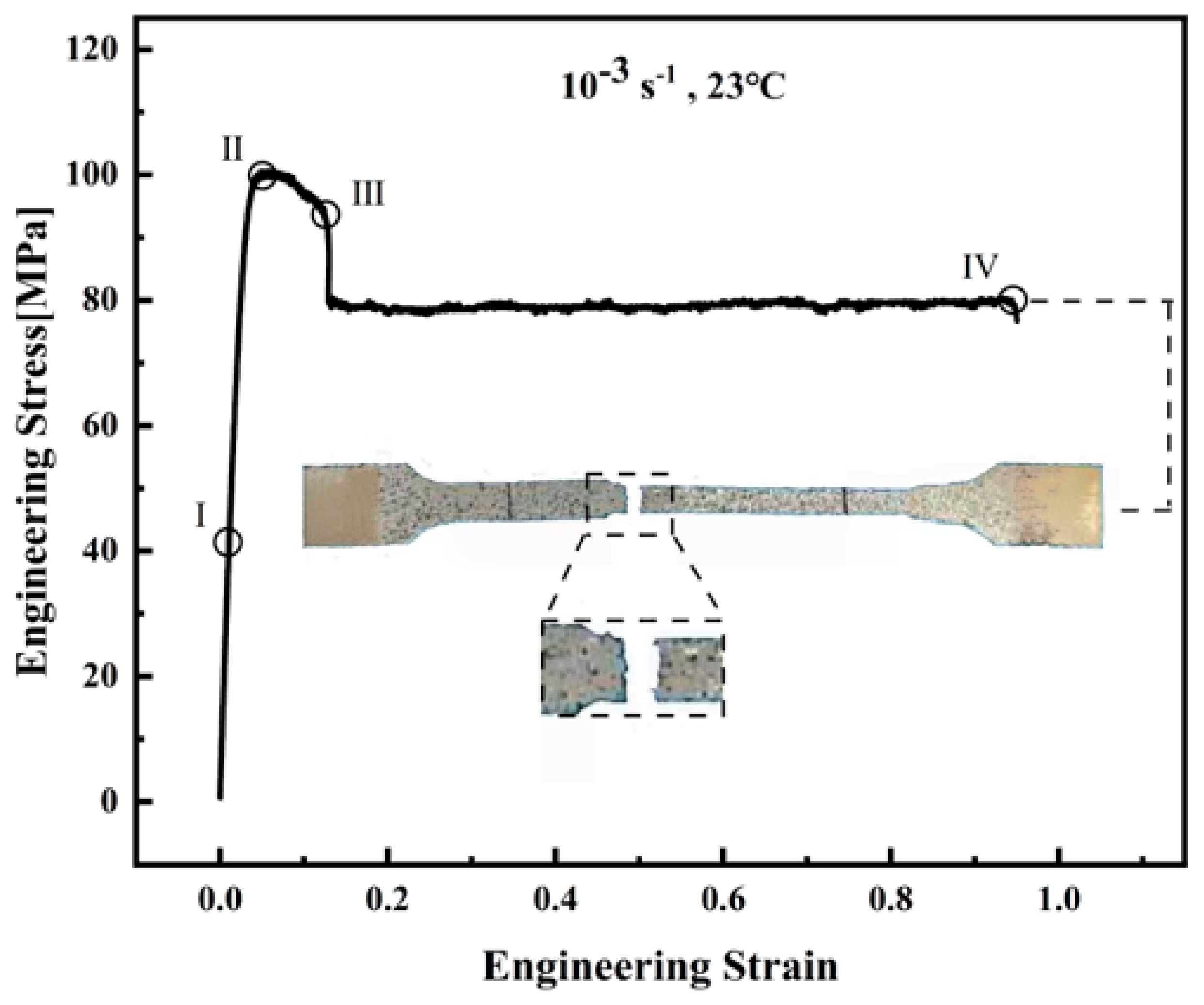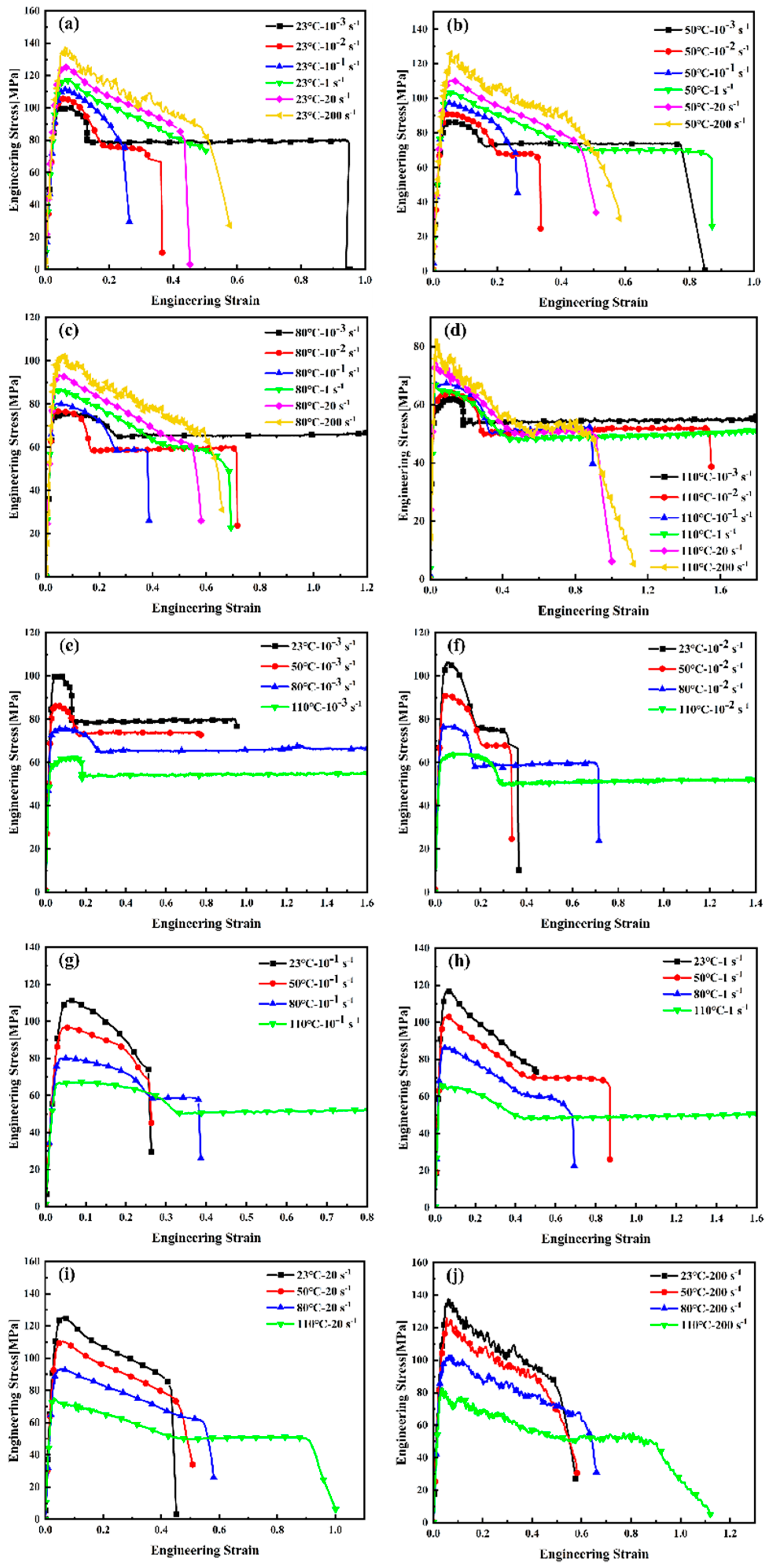Figure 3 presents the engineering stress–strain curves obtained at room temperature (23 °C) and a strain rate of 10