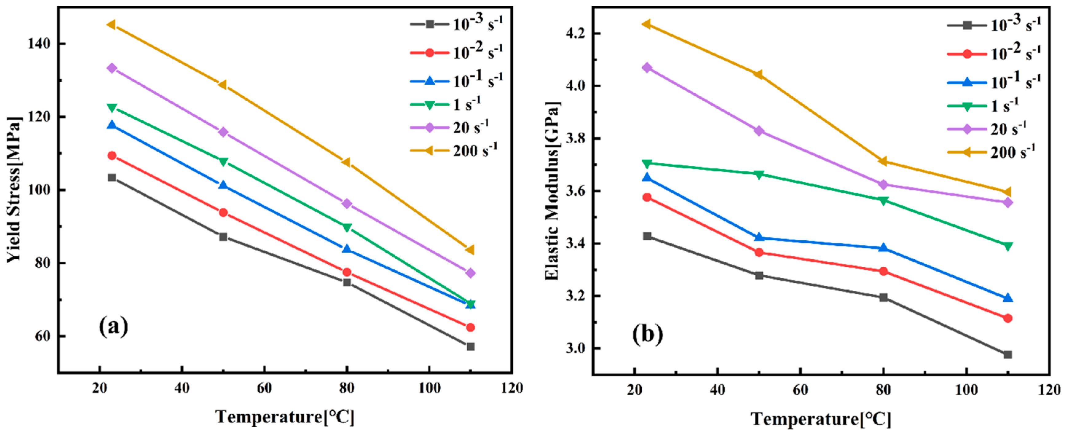 −1. The curves exhibit characteristic viscoelastic deformation behavior, marked by an initial linear elastic region followed by nonlinear yielding and plastic flow. The observed increase in yield stress with decreasing temperature or increasing strain rate demonstrates the pronounced temperature and strain rate sensitivity of PEEK’s flow stress and yield strength. In