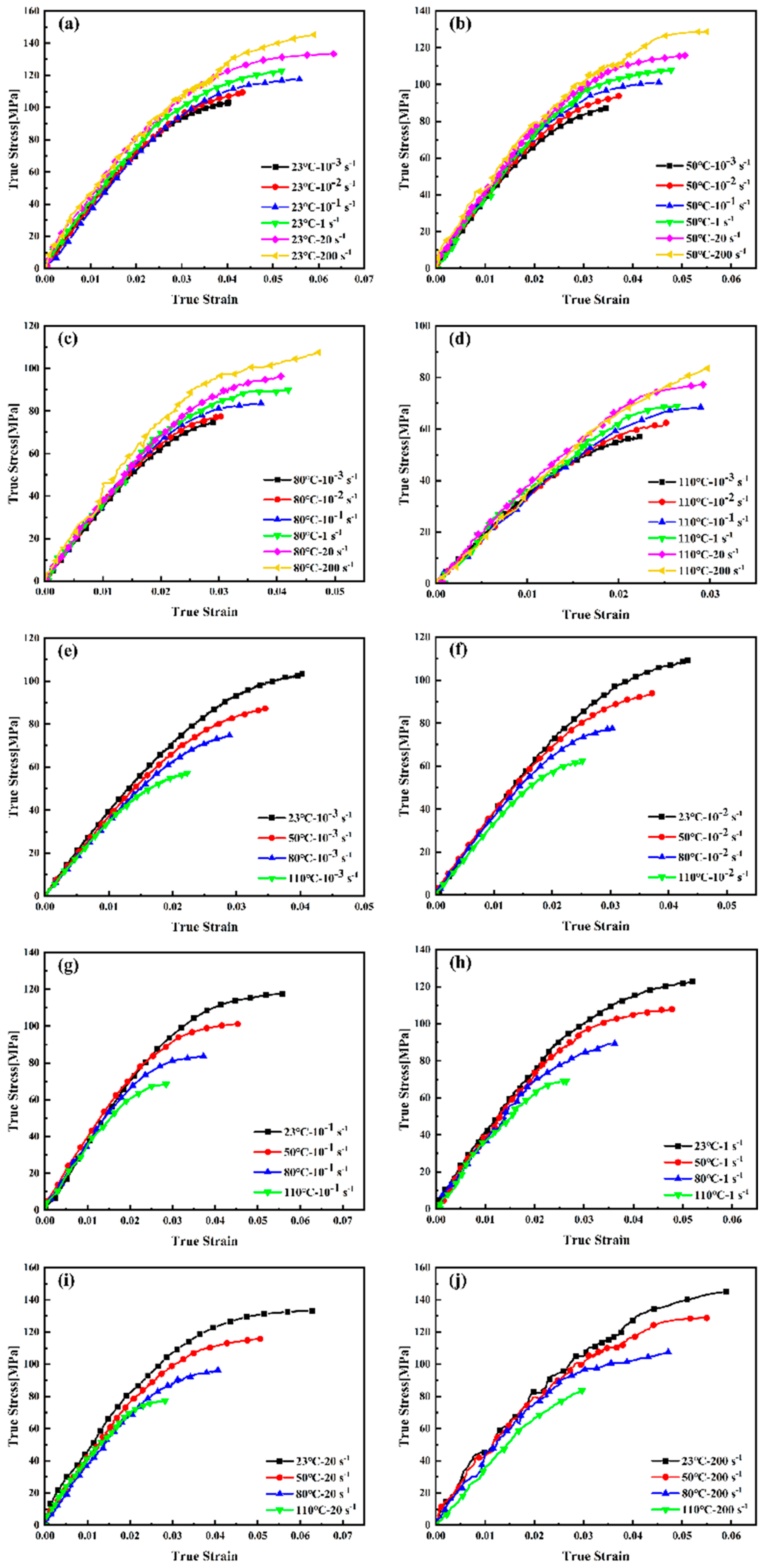The true pre-yield stress–strain curves of PEEK under varying temperature and strain rate conditions, computed using Equations (3) and (4), are presented in