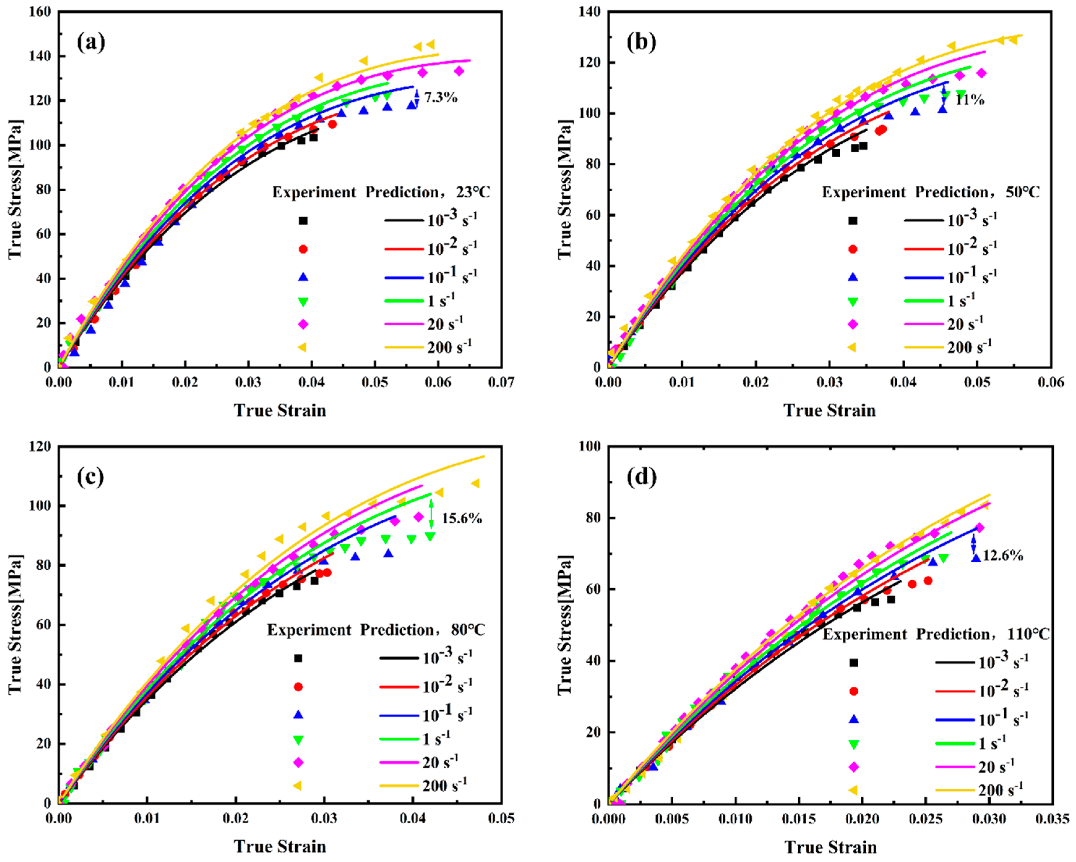 10], which incorporates chain segment motion, Ree–Eyring activation volumes, and micro-relaxation processes. While this model can accurately predict the mechanical behavior of thermoplastic materials, its complex mathematical formulations, numerous parameters, and high sensitivity limit its practical applicability under broad temperature–rate ranges.