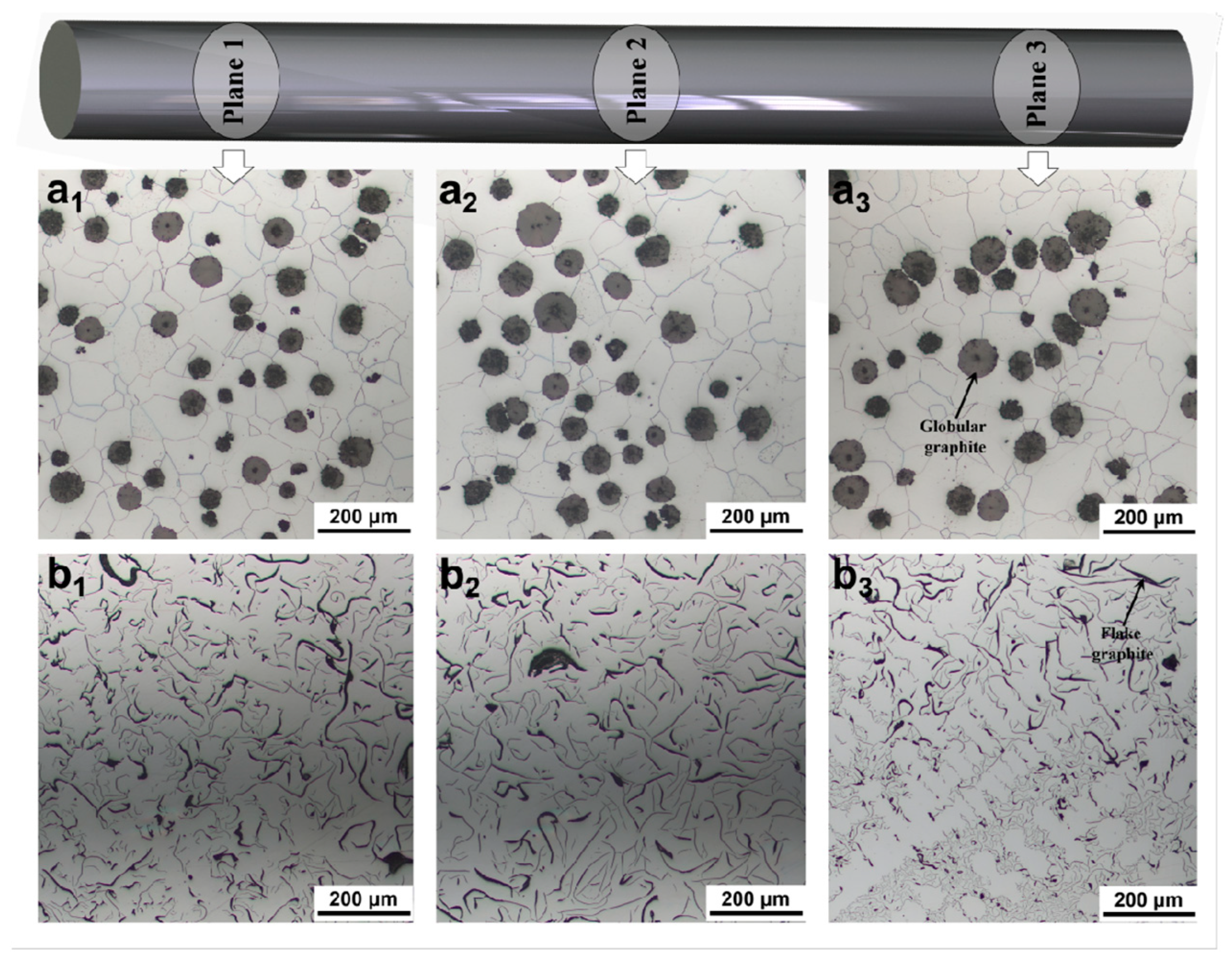 3)) exhibit a typical microstructure composed of a ferritic matrix with uniformly distributed globular graphite nodules. These nodules are spherical or near-spherical in shape and vary slightly in size, but their overall morphology remains consistent across the three observed planes, indicating a relatively homogeneous distribution throughout the casting. This uniformity is crucial for ensuring reliable mechanical performance and for constructing accurate representative volume elements (RVEs) [