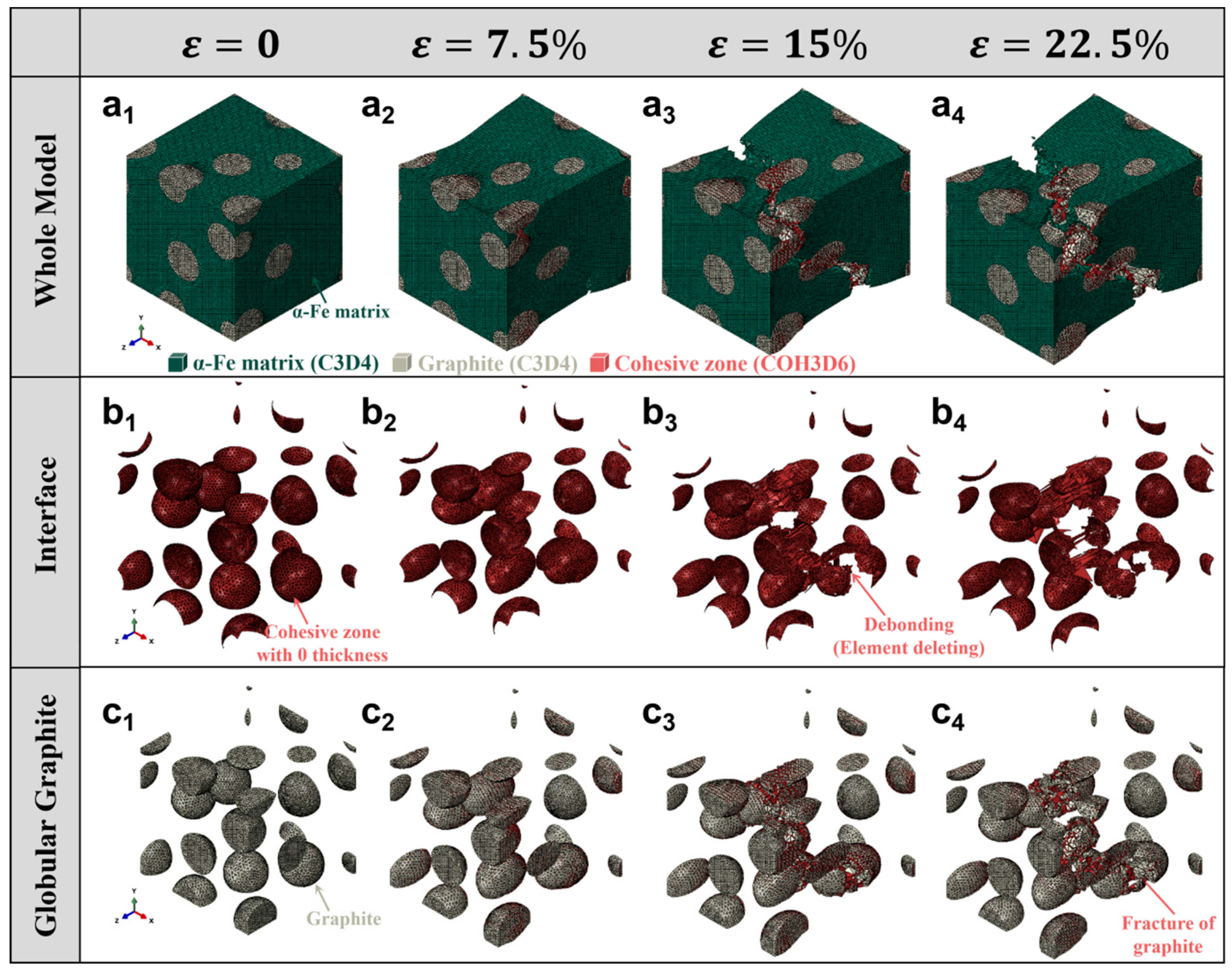 4) zooms into the individual spherical graphite particles, revealing their internal structure and fracture behavior. Although spherical graphite is generally considered more favorable for ductility due to reduced stress concentration, the simulation shows that under high strain, brittle fracture still occurs within the graphite itself, especially near the equator or along preferred crystallographic planes. The appearance of red cohesive zones and fragmented particles indicates crack initiation and propagation inside the graphite, consistent with experimental observations of microcracking in graphite nodules.