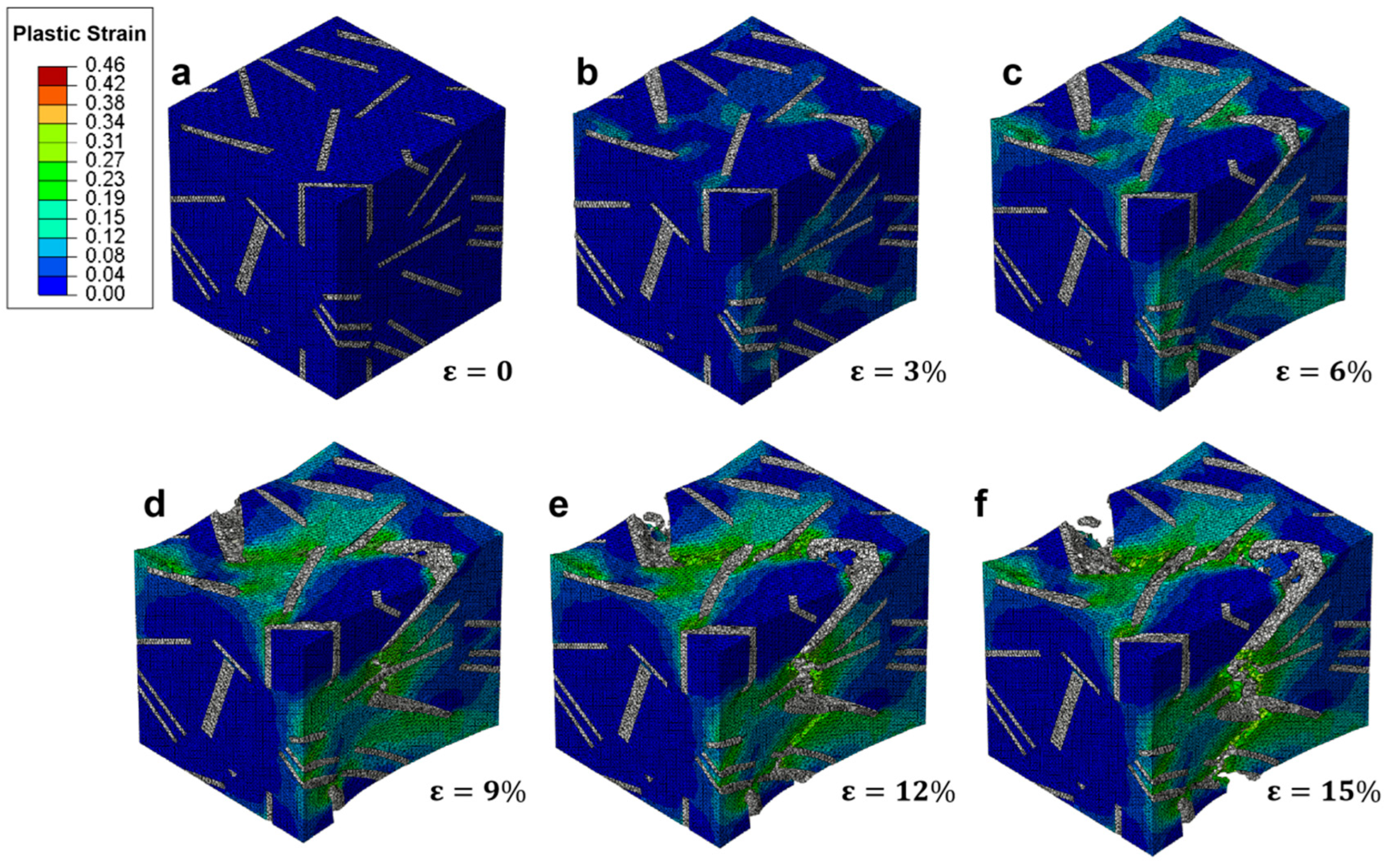 Figure 9e), multiple cracks have formed and coalesced into a dominant fracture path, resulting in a macroscopic failure zone. The plastic strain field is highly localized along this path, with little further deformation occurring in other regions. At 15% strain (