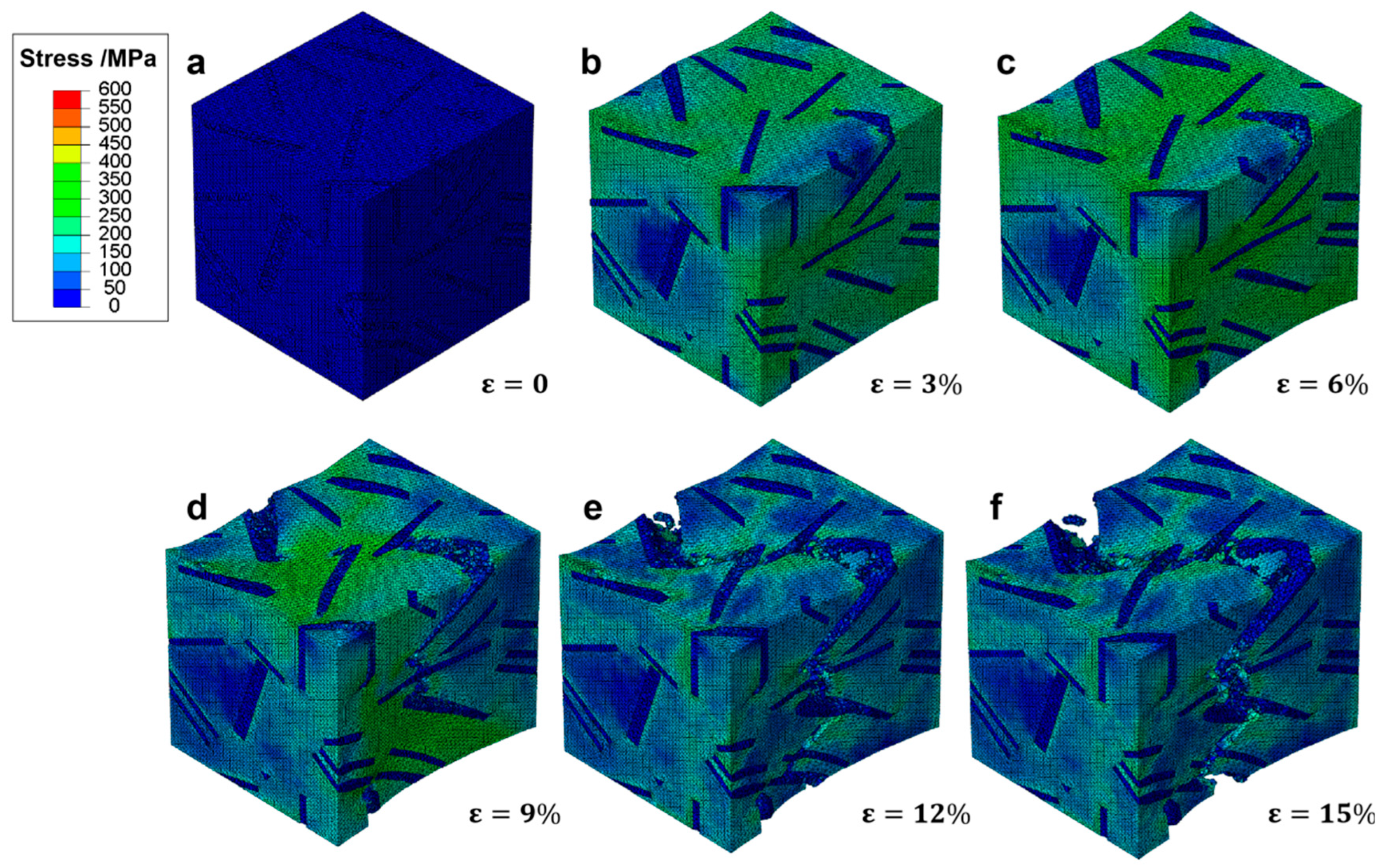 Figure 11d), microcracks nucleate at the graphite-matrix interfaces, especially at the tips of the flakes where triaxial stress states prevail. These cracks propagate rapidly along the plane of the flakes, leading to a sudden drop in local stress levels in affected areas. The onset of damage results in load shedding from the fractured regions, but the remaining intact matrix continues to carry the load. At 12% strain (