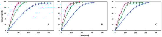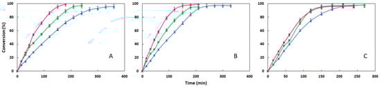 The average reaction rate in the first 30 min, as well as the time required to reach a conversion of more than 95% are the parameters used to compare the results (Table 3).