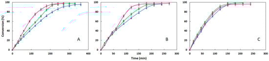 In this study, the synthesis of three esters derived from palmitic, myristic and stearic acids with C20 Guerbet alcohol, 2-octyl-1-dodecanol, has been developed. In all of them, three amounts of Lipozyme® 435 lipase (0.25, 0.5 and 1 g) have been tested, corresponding to concentrations of 1.25, 2.5 and 5% (w/w) with respect to the total amount of initial substrates. The results obtained are shown in Figure 2, which illustrates the evolution of the conversion with time for the various tests conducted with increasing amounts of enzyme for each ester obtained. The comparison between them will be made by analyzing the average reaction rate in the first 30 min, as well as the time required to reach a conversion of more than 95% (Table 2).