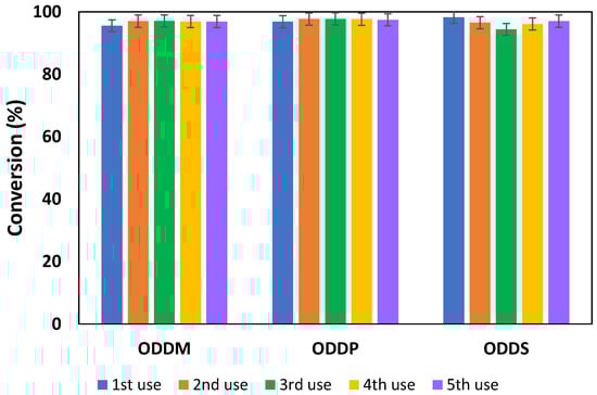 Reusability of the biocatalysts Lipozyme® 435 for the synthesis of ODDM, ODDP and ODDS under the best operational conditions: 2.5% w/w, 20 g of substrates, 350 rpm; molar ratio 1:1, 90 °C (ODDM and ODDP), 80 °C (ODDS).