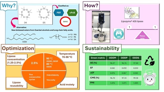 - Montiel, C.; Gimeno-Martos, S.; Ortega-Requena, S.; Serrano-Arnaldos, M.; Máximo, F.; Bastida, J. Green production of a high-value branched-chain diester: Optimization based on operating conditions and economic and sustainability criteria. Appl. Sci. 2023, 13, 6177. [Google Scholar] [CrossRef]